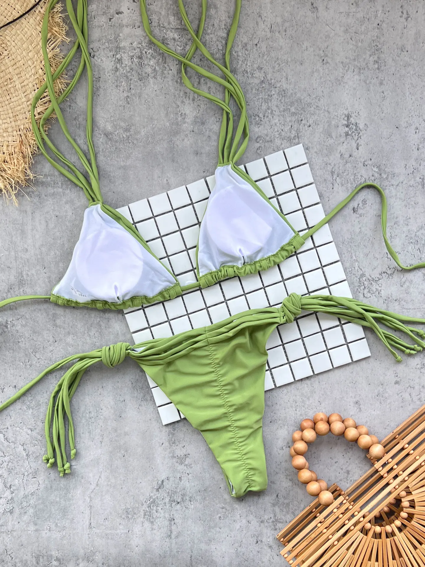 JSN OEM Custom Luxury Bathing Suit for Women Sexy String Ribbed Bikini Set With Lace up Beads Plus Size Bra Tie Beach