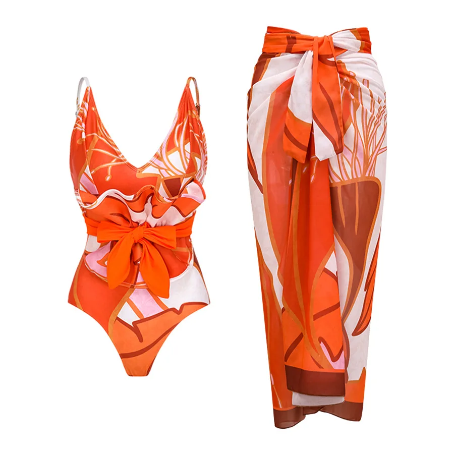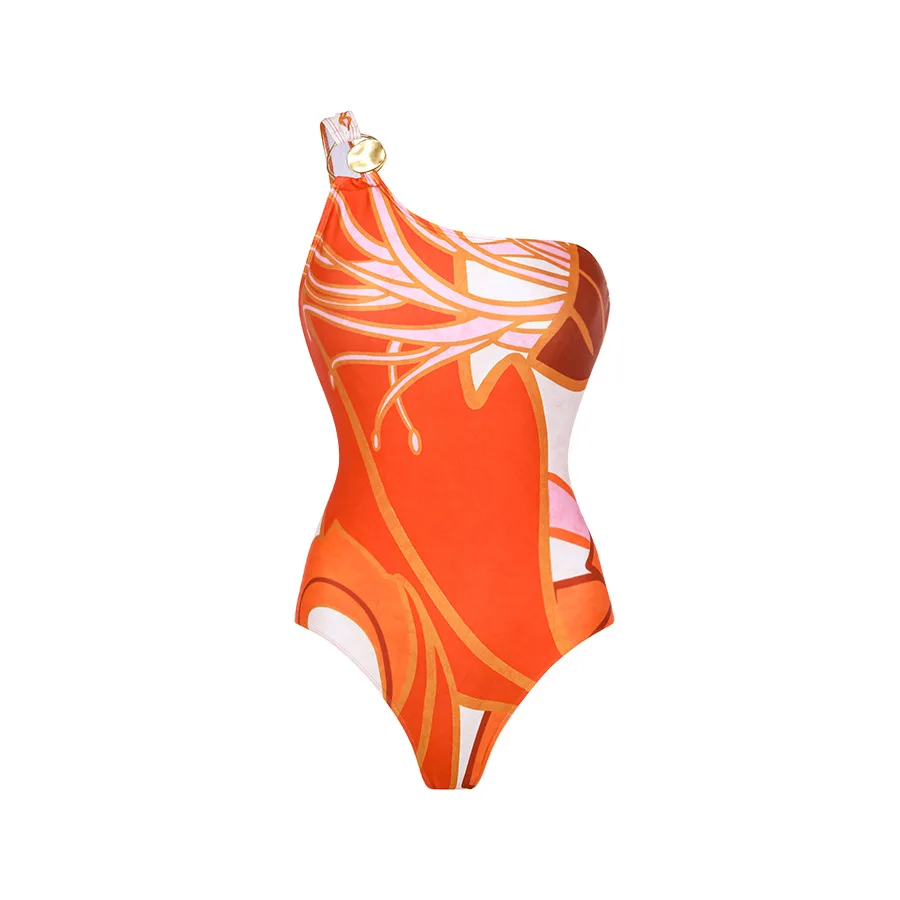 JSN V-neck Bow Tie One Piece Swimsuit One Shoulder Metal Buckle Leaf Print Swimwear Woman