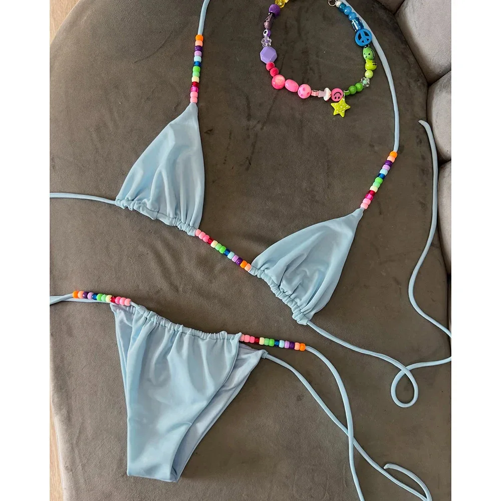 JSN 2026 Customized Fashionable Hot Selling Strappy Two Piece Bikini Set Solid Beading Backless Beach Swimsuit for Women
