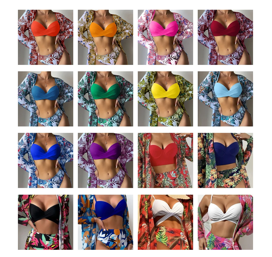 JSN New Designer Bathing Suits Green Leaf Print Bikini Swimsuit Long Sleeves Cover up 3 Piece Swimwear