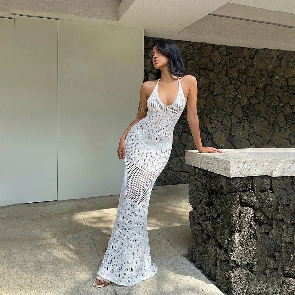 JSN 2026 Customized Hot Sale New Designer Solid Color Sexy Knitted Halter Hollow Backless Swim Suit Women's Sexy Beach Dress