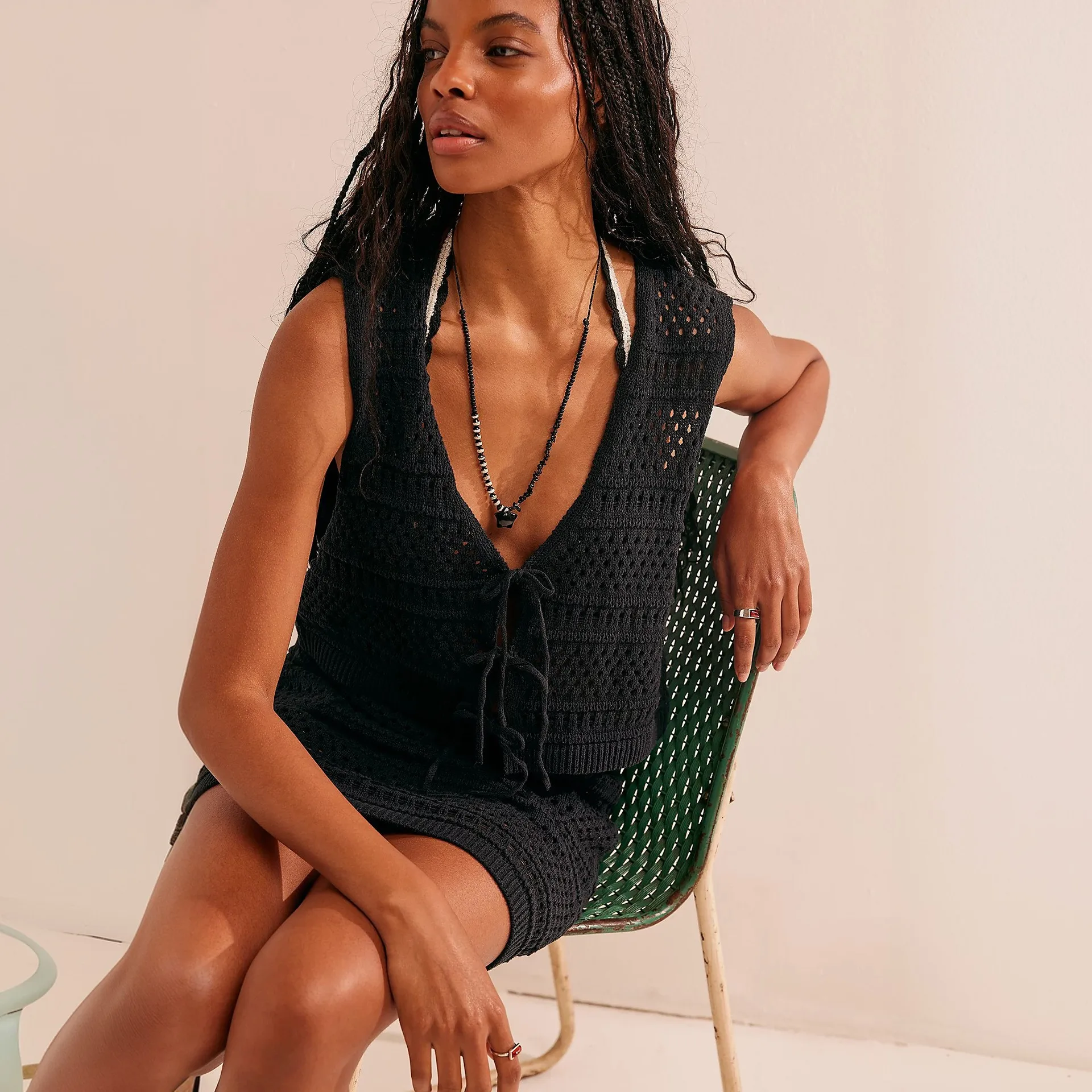 JSN 2026 Customized New Design Two Piece Solid Sexy Knitted Hollow-Out Beach Cover-Up Bikini Deep v Neck Swimsuit Beach Shirt