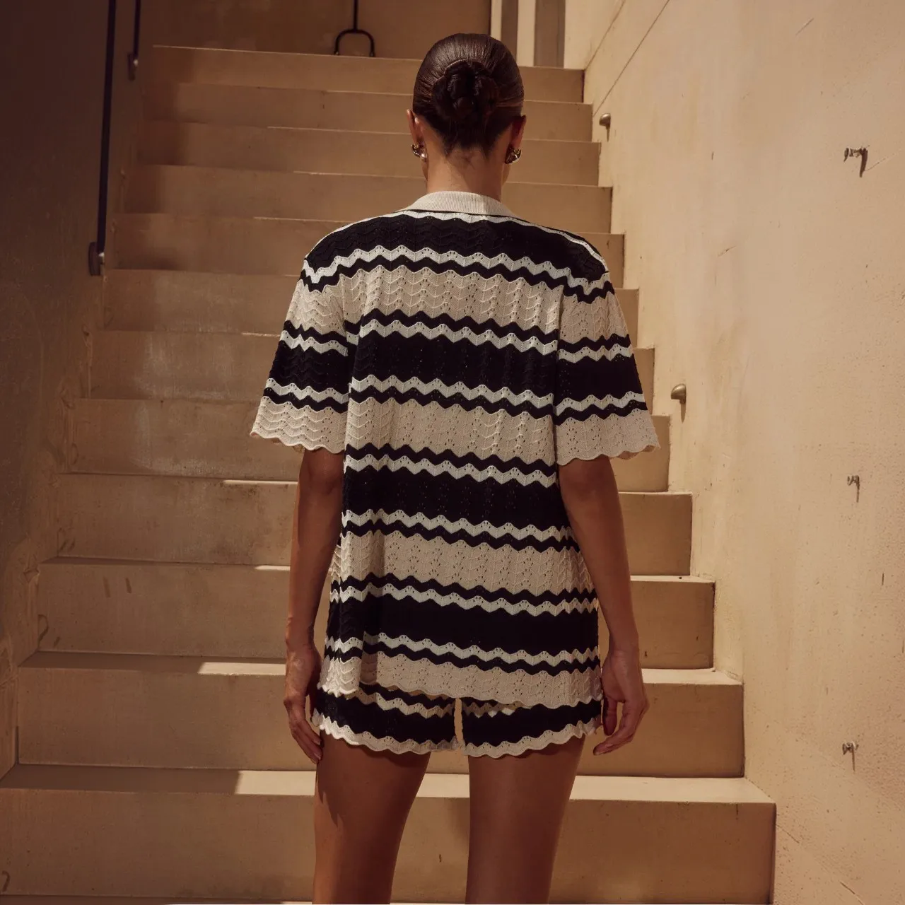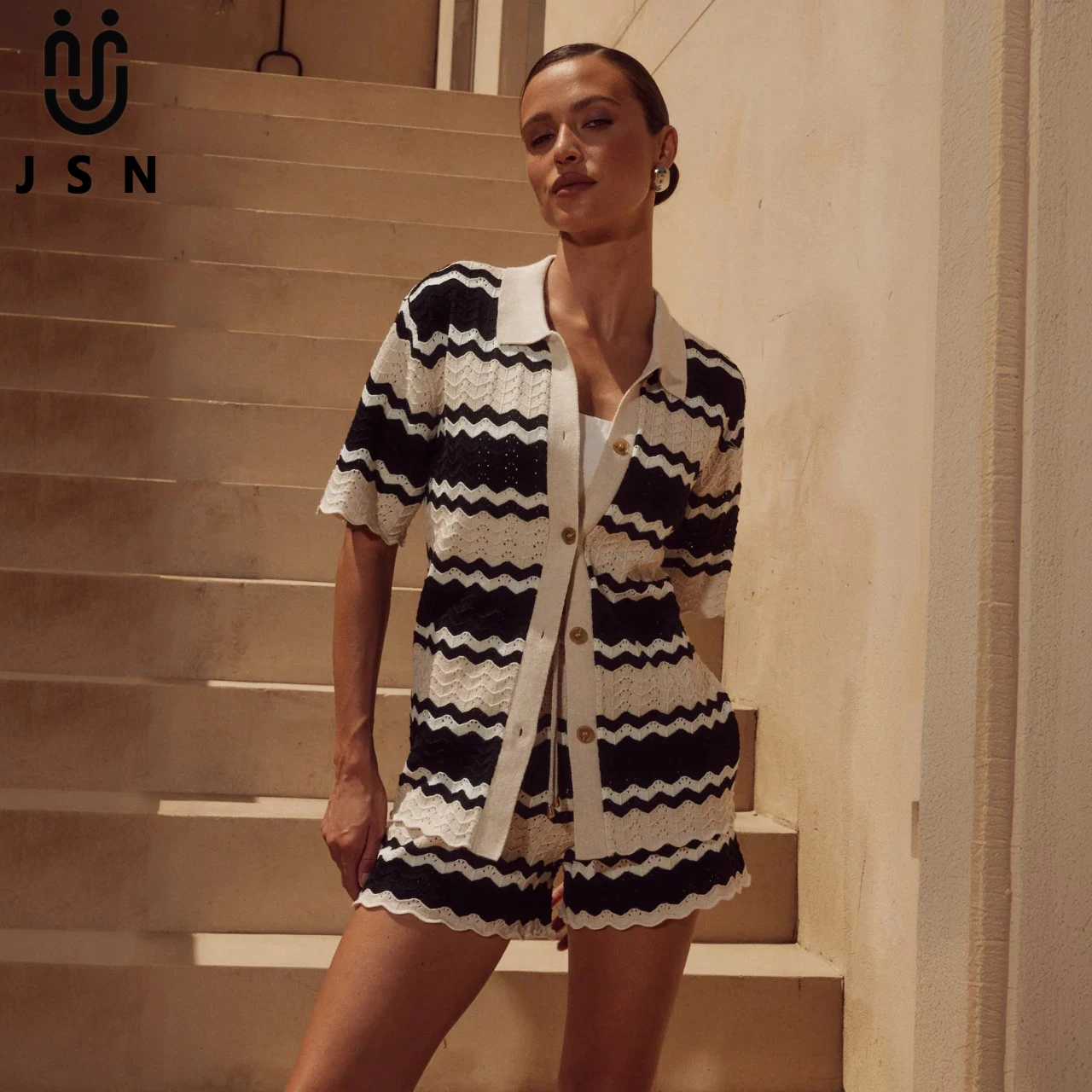 JSN 2026 Customized Sexy Cutout Striped Beach Cover-up Bikini Swimsuit Beach Set for Women Two Piece Bikini Set with Shorts