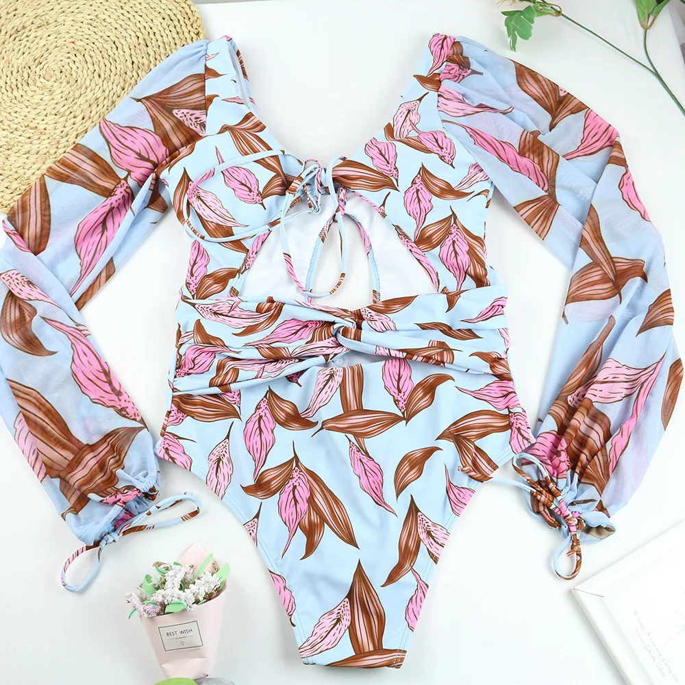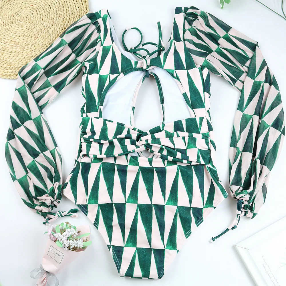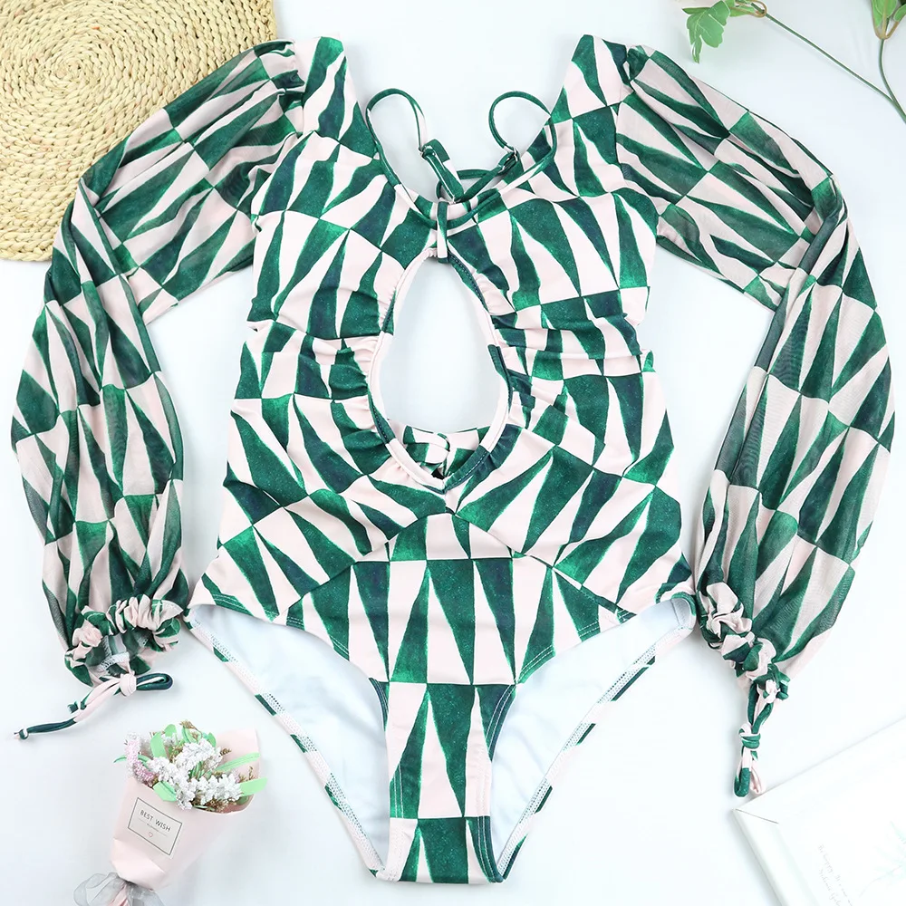 JSN Customize OEM 2026 Private Label Swimwear Beachwear Mesh Bikini Swimsuit Hollow Out Women Long Sleeve One Piece Swimsuit