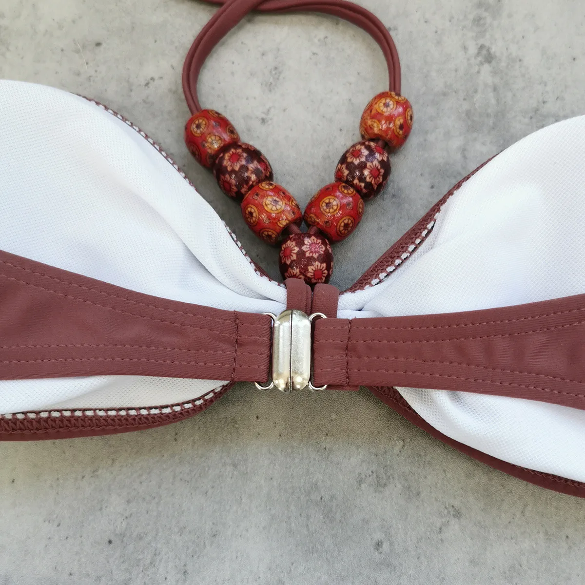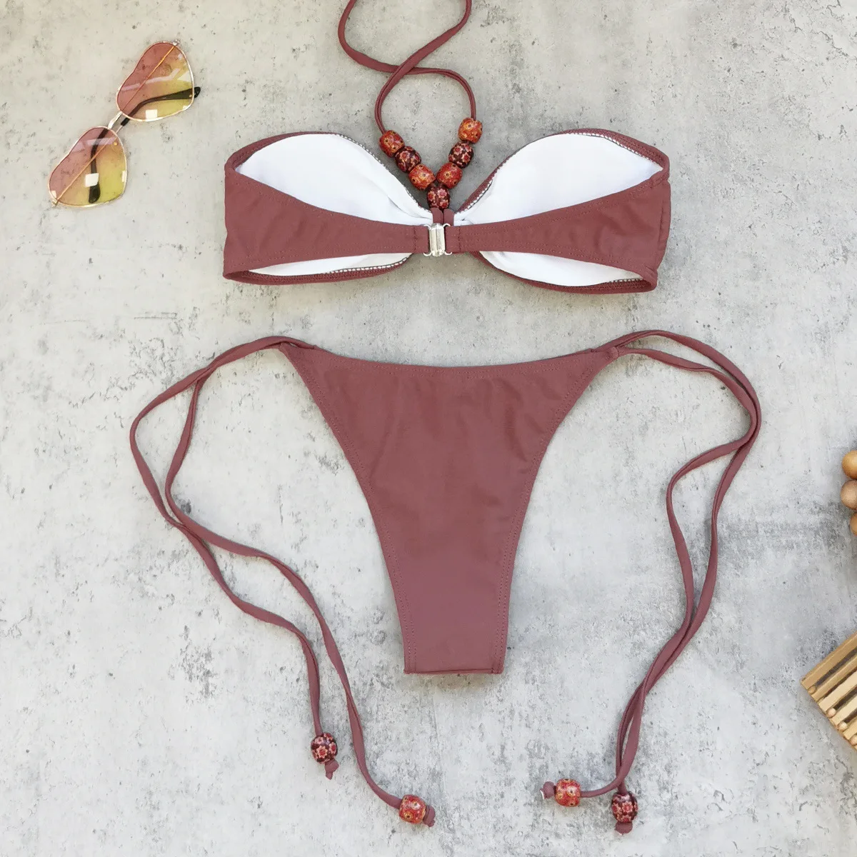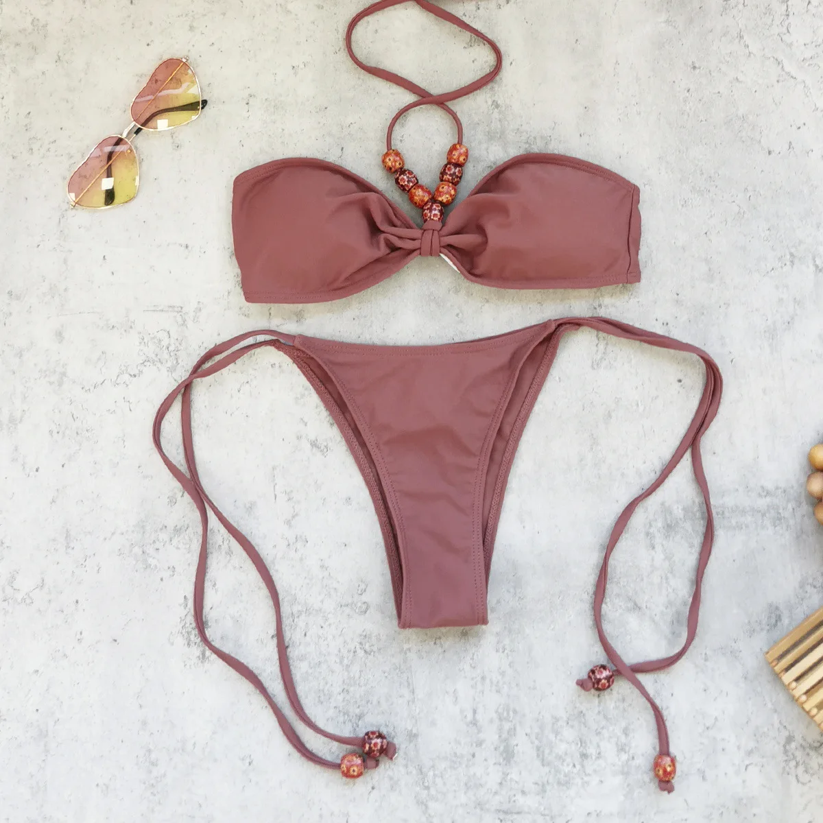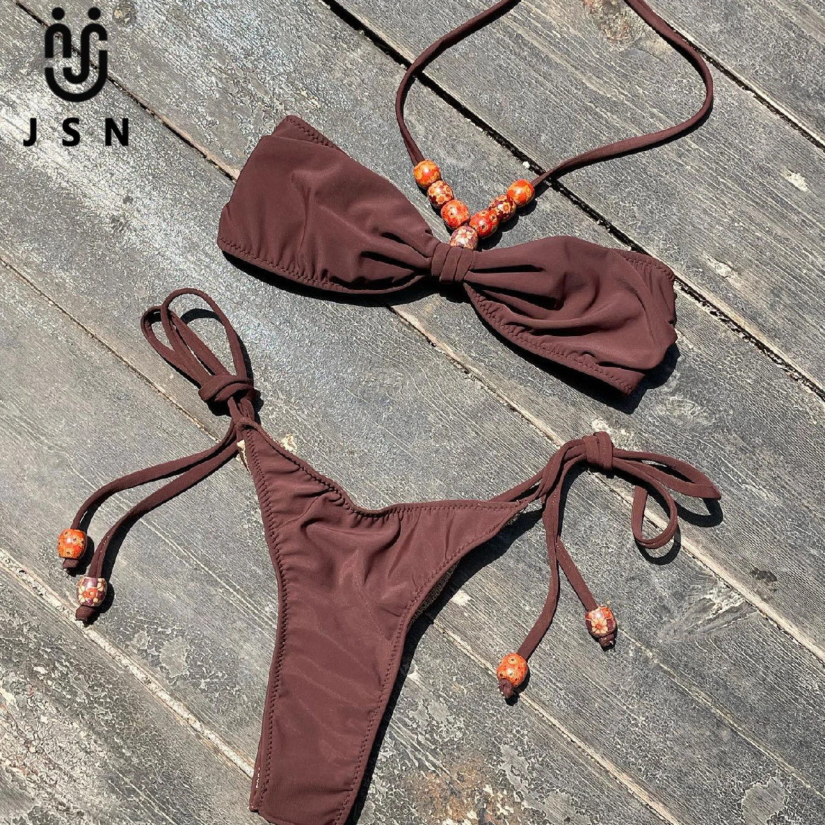 JSN 2026 Customized Halter Strapless Bandeau Sexy Backless Solid Two-piece Beading Swimsuit for Women Low Waist Thongs Bikini