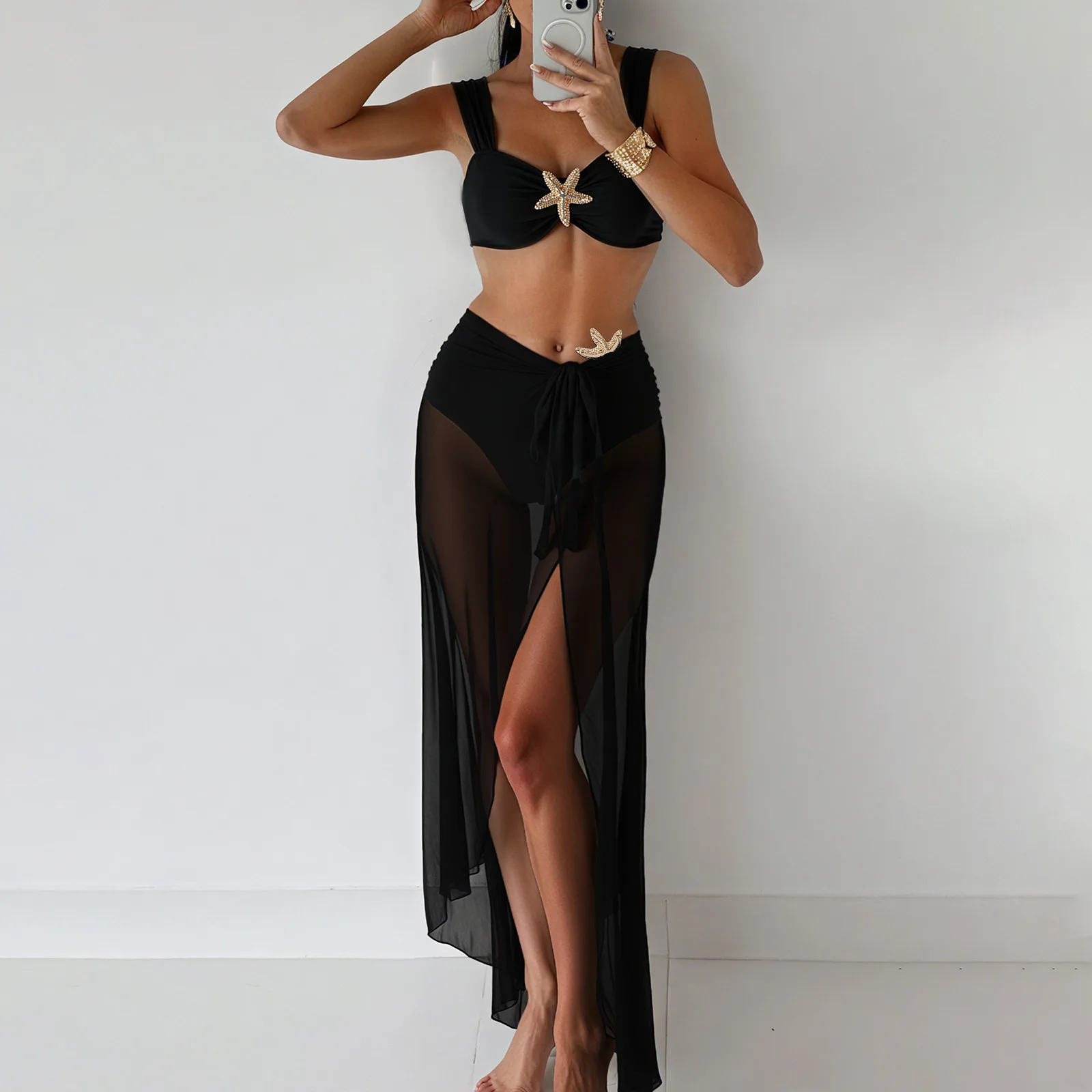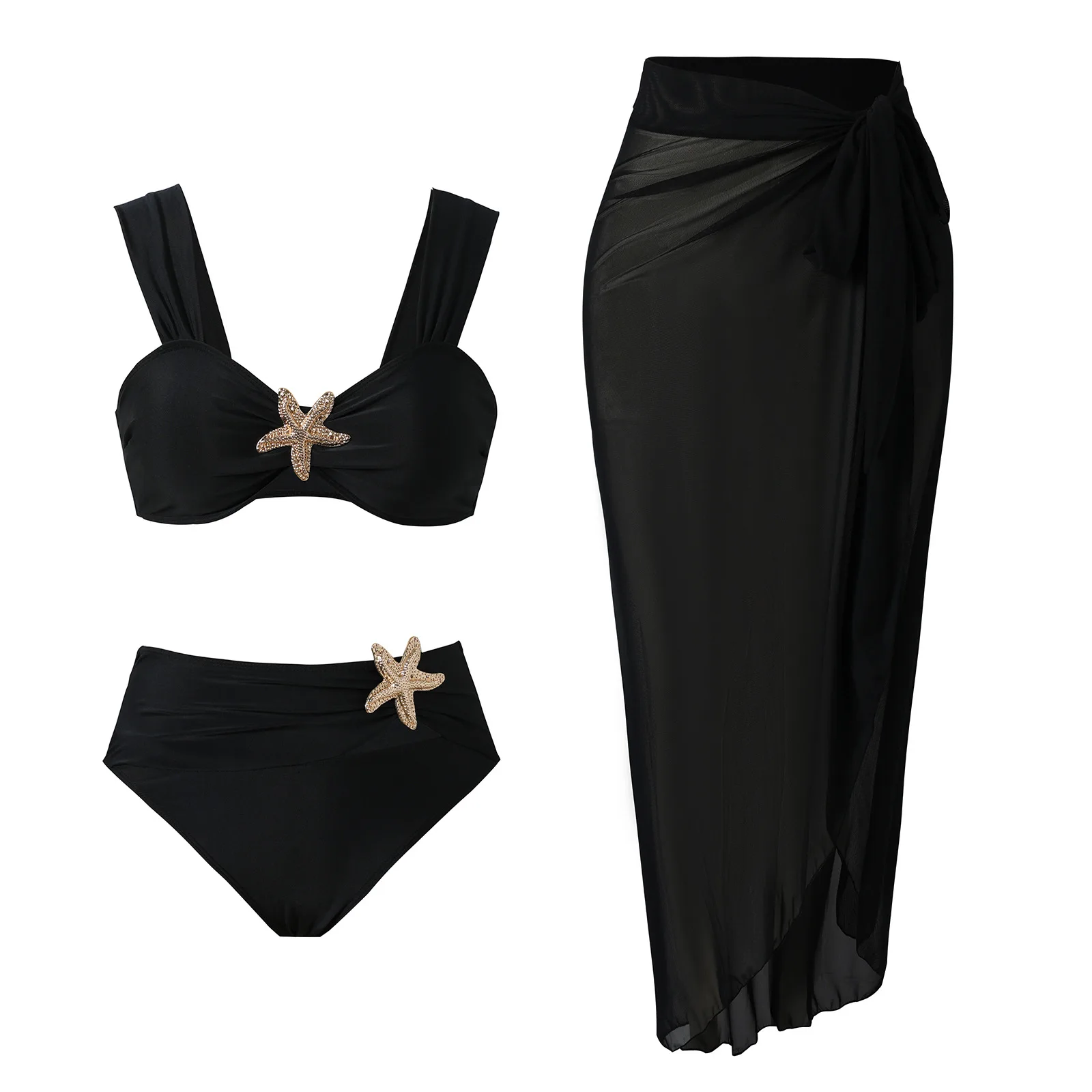 JSN 2026 Customized New Design Three Piece Set Bikini with High Cut Swimdress Women's Solid Swimsuit with Metallic Accessories
