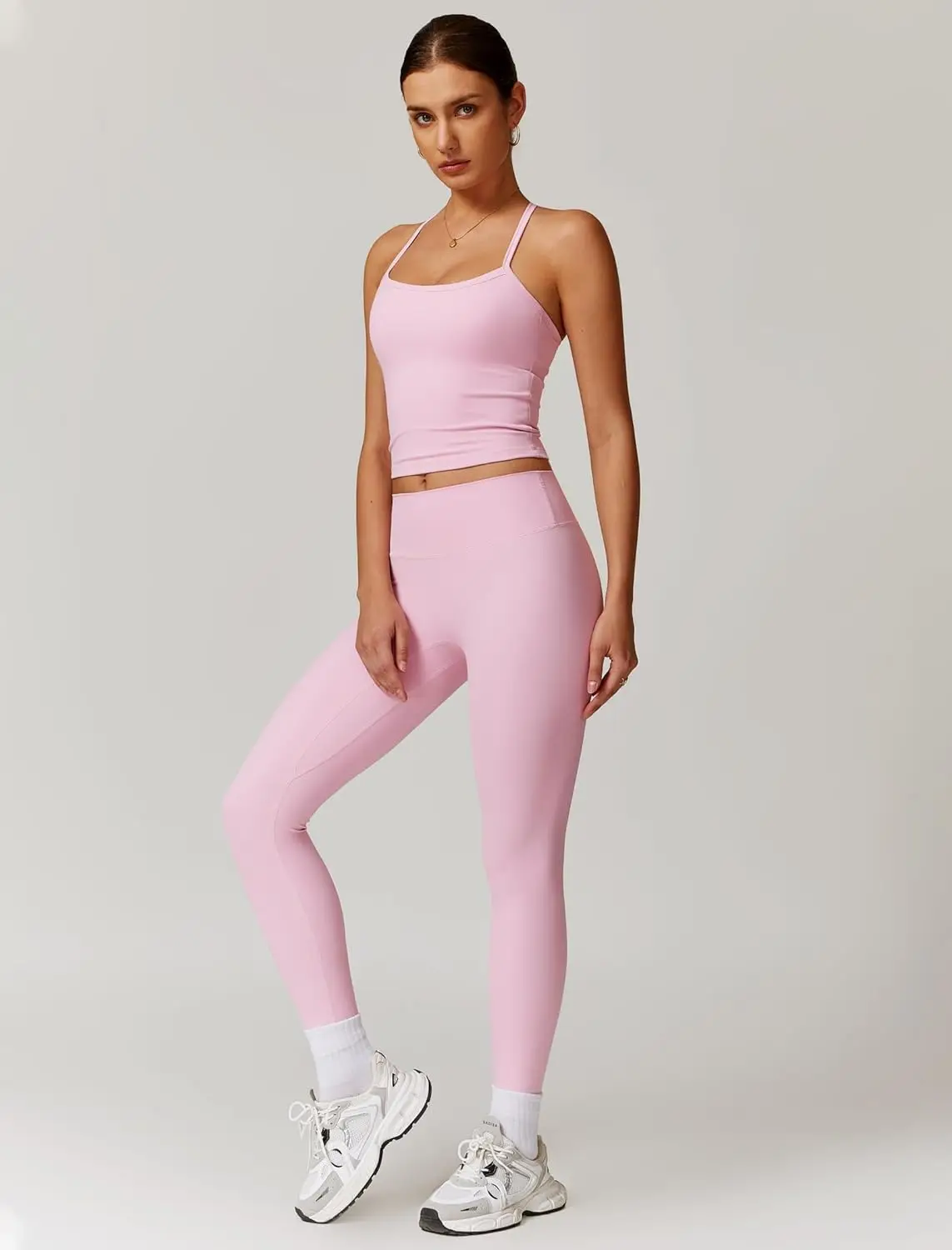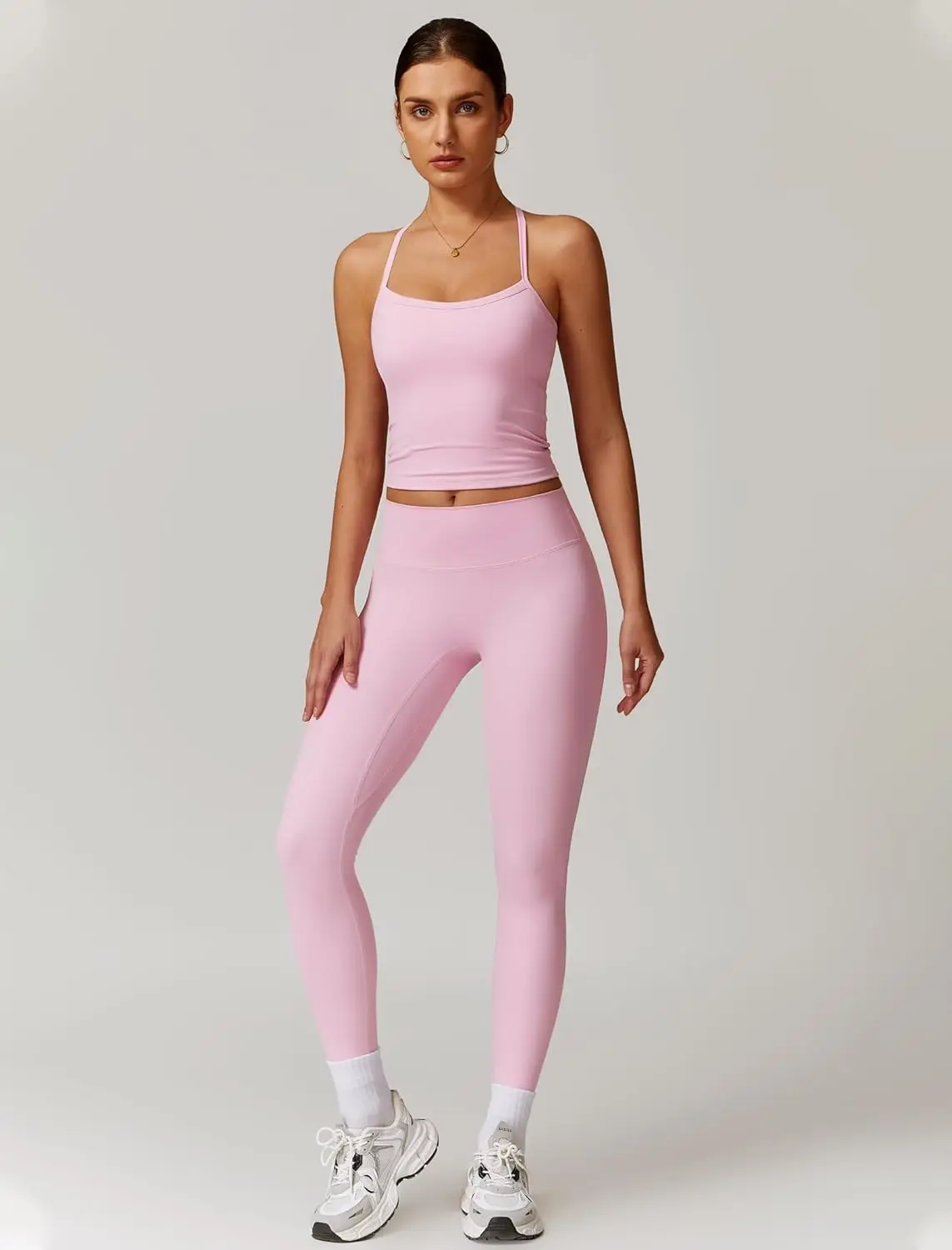 Womens Breathable Spandex/Nylon Workout Sets Two Piece Cross Back Tank Top Matching High Waist Full Length Leggings Sets