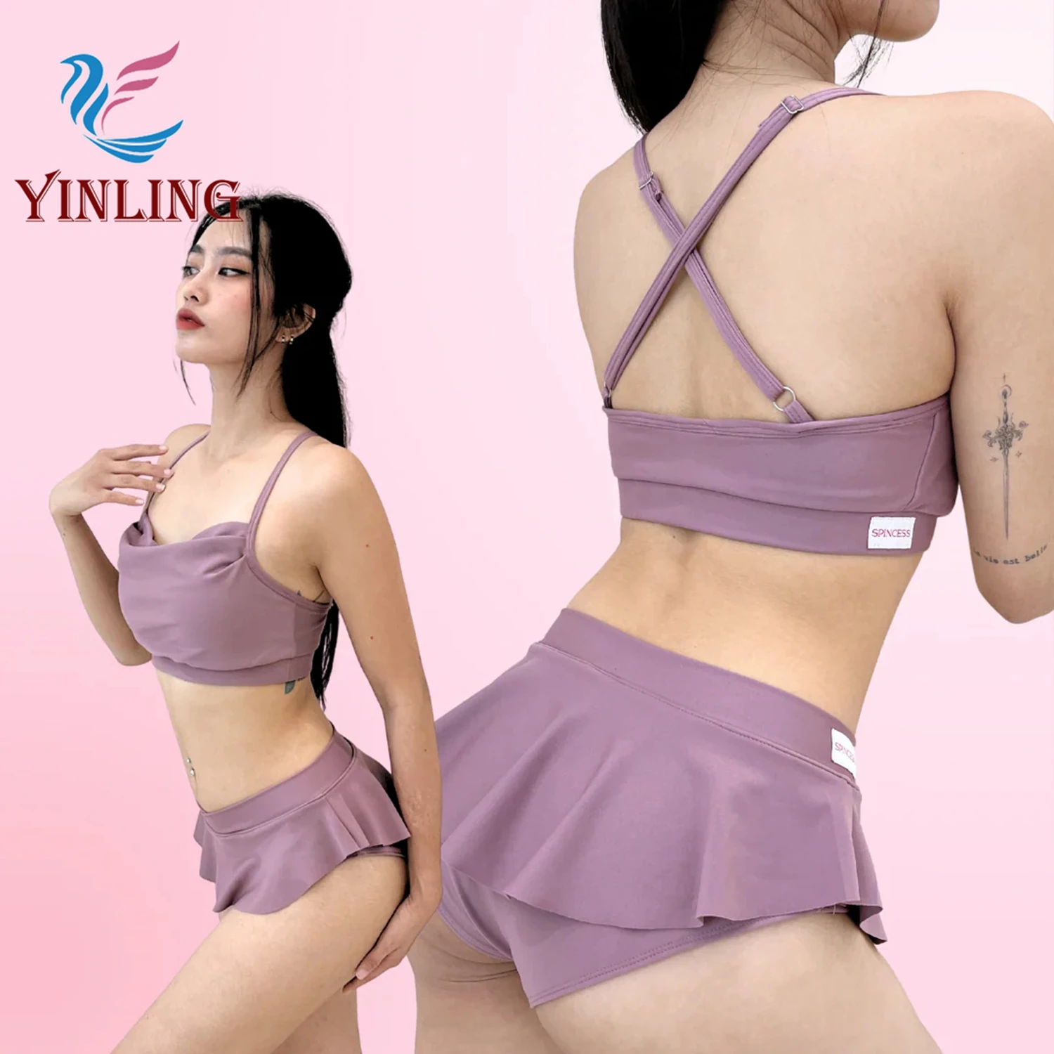 Wholesale Price Purple Matte Nylon Women Ruffle Shorts Pole Active Wear Set Mid High Waist Sexy Ladies Fitness Dance Clothing