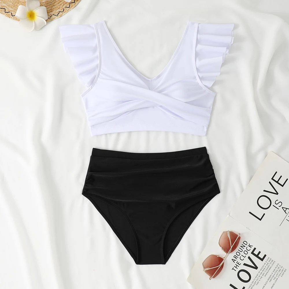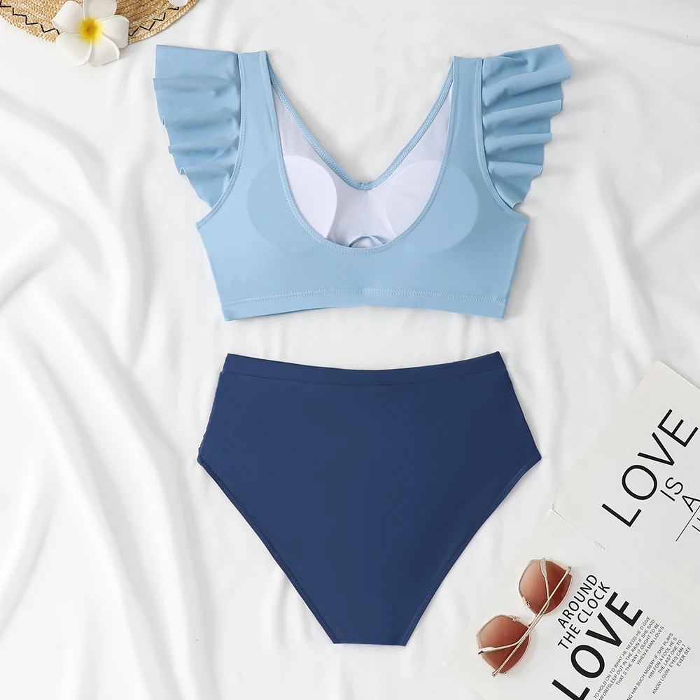Custom 2026 New Sexy Solid Ruffle Two Piece Bikini Set V Neck Swimsuit Women High Waist Thong Fitness Swimwear