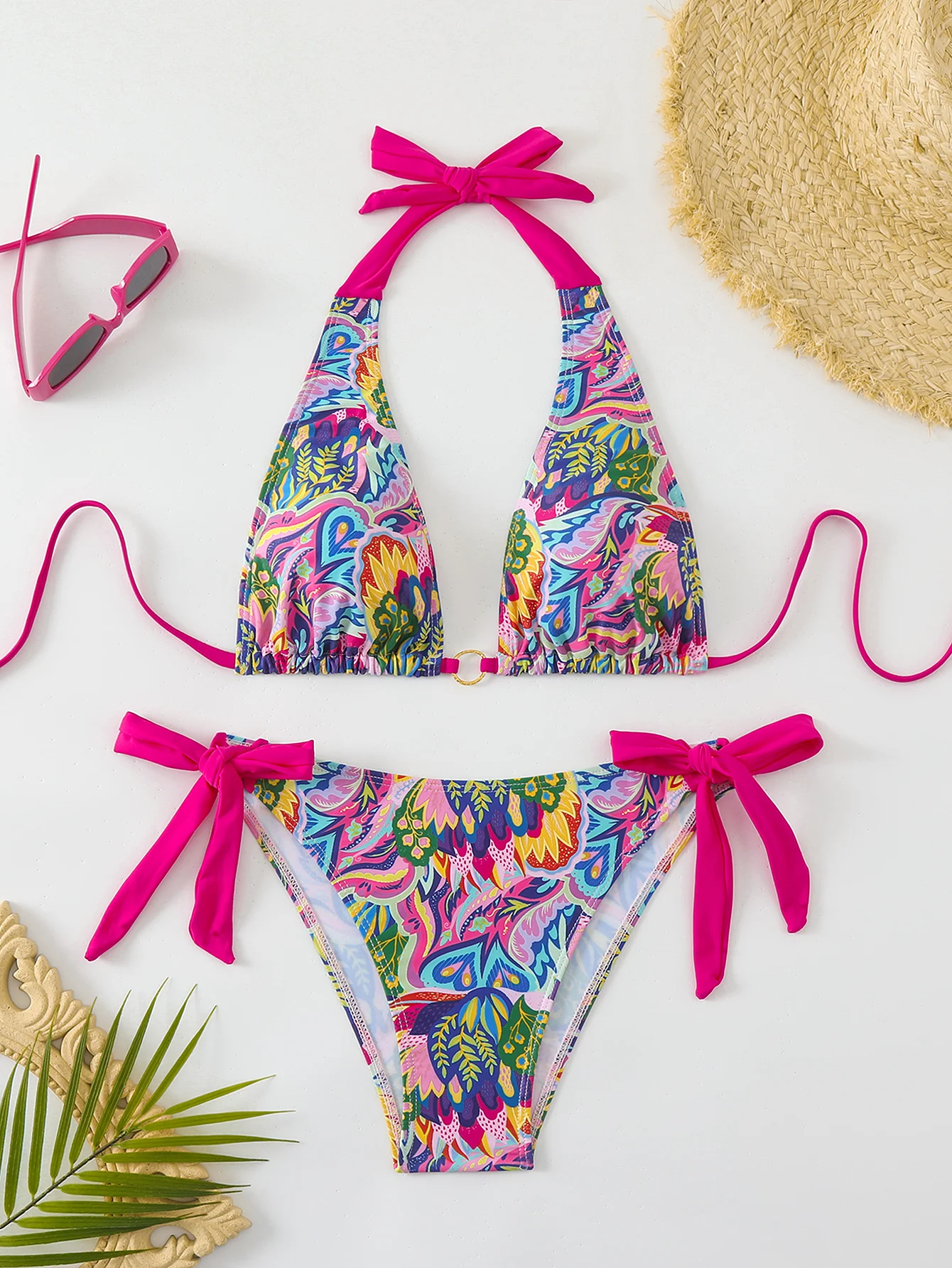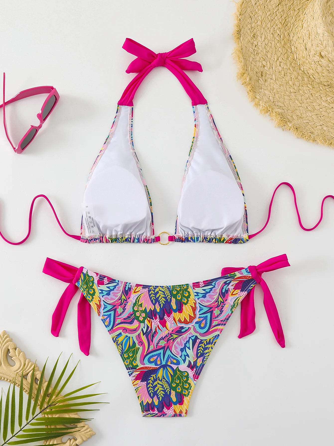 Manufacturer Custom New Sexy Floral Metal Ring Two Piece Bikini Triangle Halter Swimsuit Women Side Tie Thong Swimwear