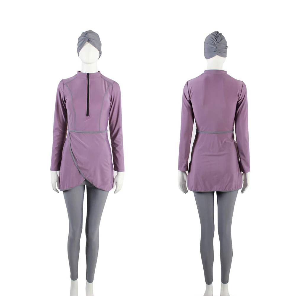 2023 in Stock New Modest Solid Muslim 3 Piece Bikini Patchwork Long Sleeve Zipper Swimsuit Women Islamic Hijab Swimwear Burkinis