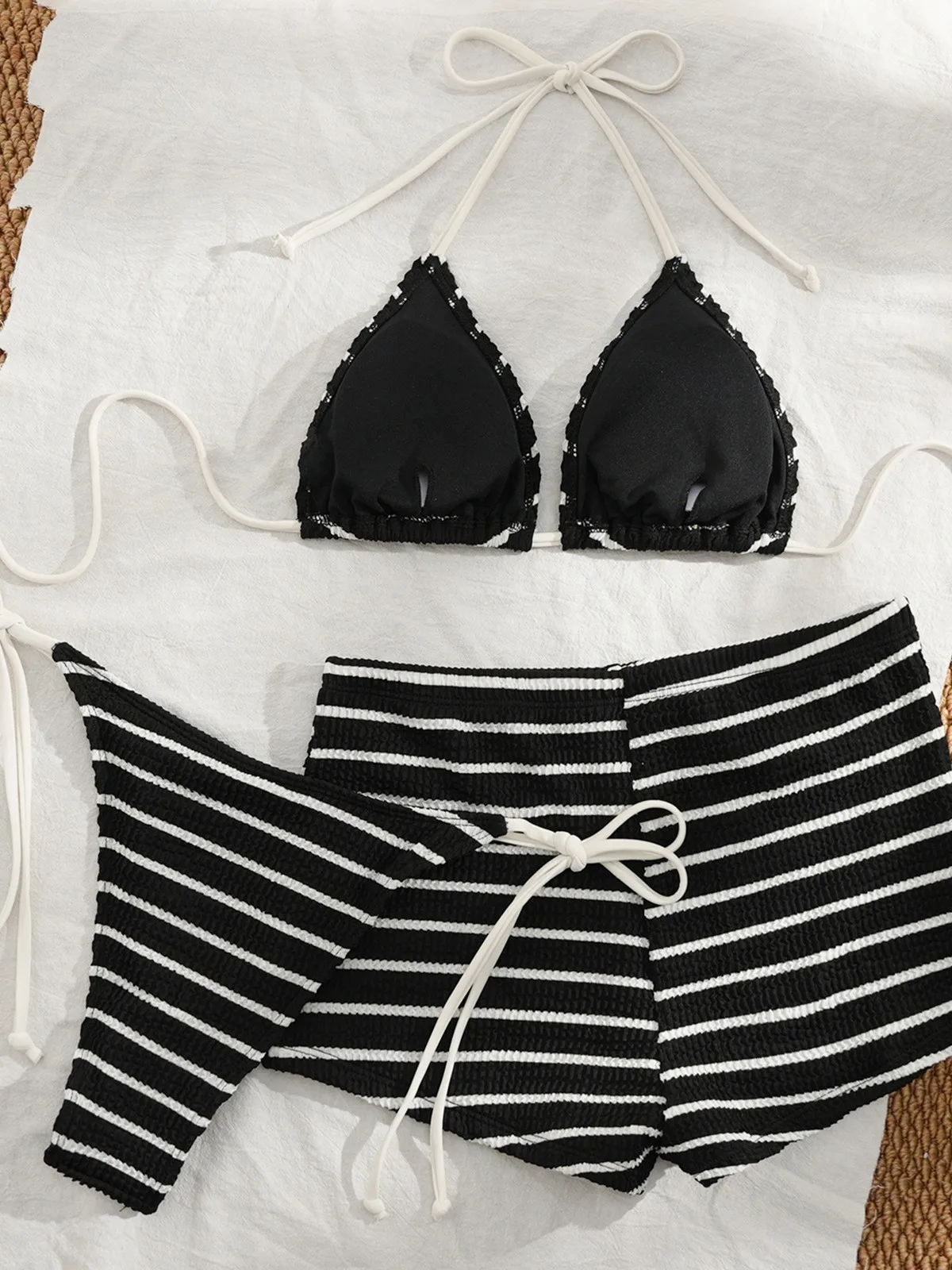 Factory Custom New Sexy Striped Print 3 Piece Bikini With Boxer Shorts Triangle Halter Swimsuit Women Thong Swimwear