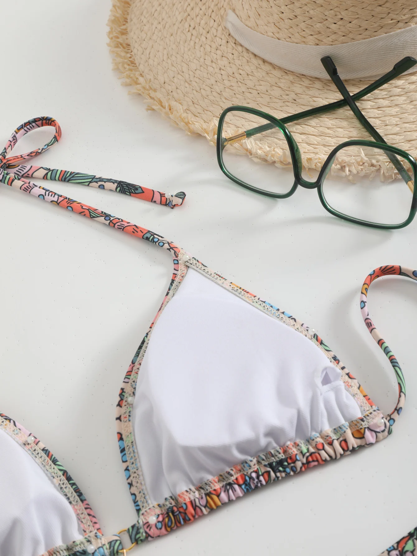 Custom New Sexy Print Metal Two Piece Bikini Triangle Halter Swimsuit Women High Waist Thong Swimwear