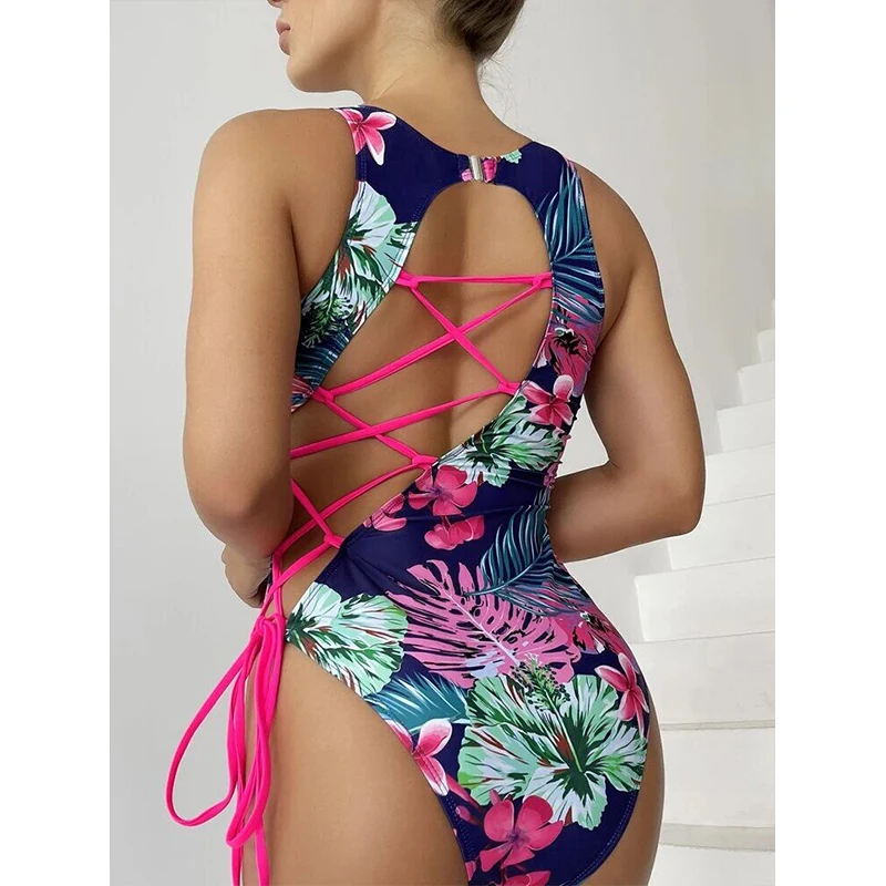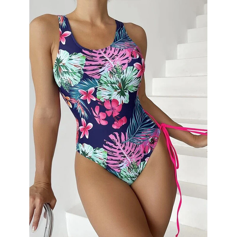 2026 New Design Sexy Floral Print One Piece Bikini Beachwear Bandeau Back Cross Side Tie Swimsuit Women High Slit Swimwear