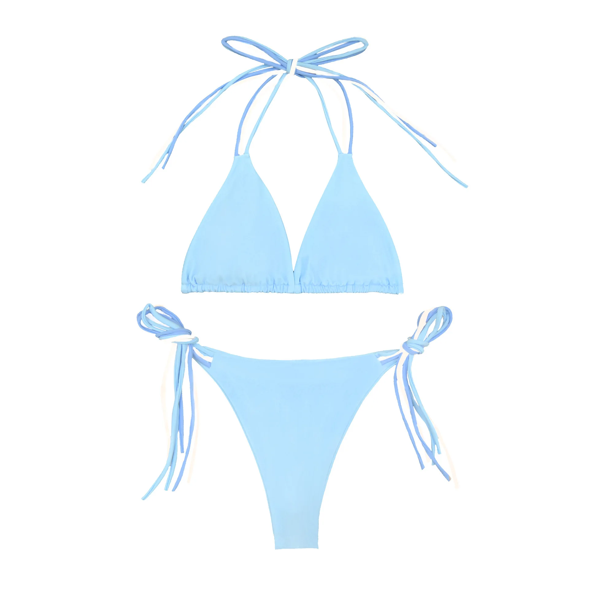 Custom New Sexy Solid Two Piece Bikini Triangle Halter Swimsuit Women Double Side Tie Pearl Thong Swimwear
