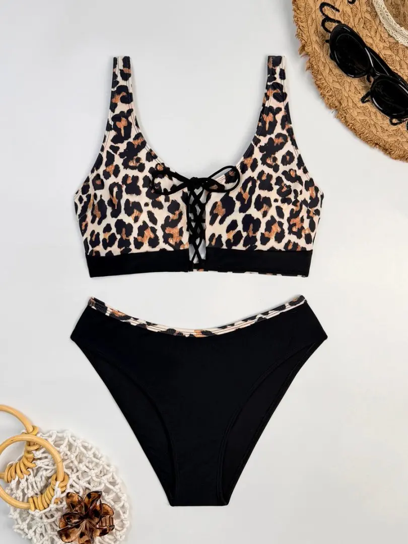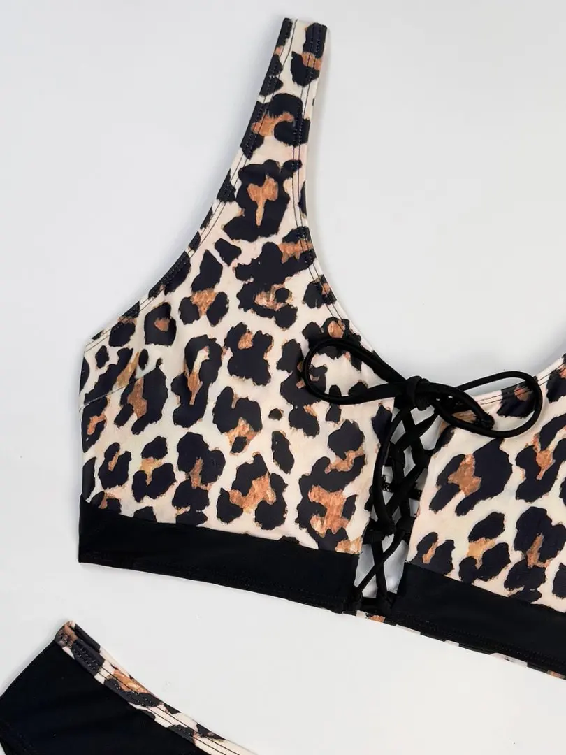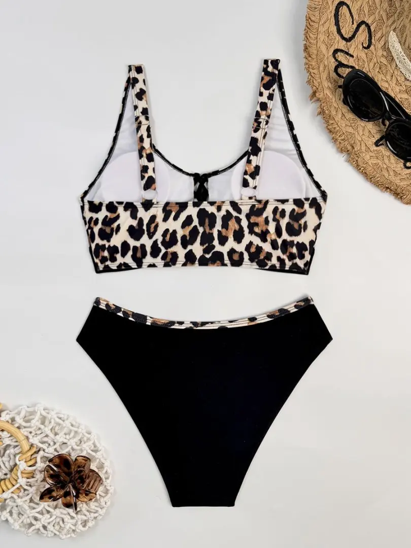 Custom 2026 New Sexy Leopard Front Tie Two Piece Bikini Set Bandeau Swimsuit Women High Waist Thong Fitness Swimwear