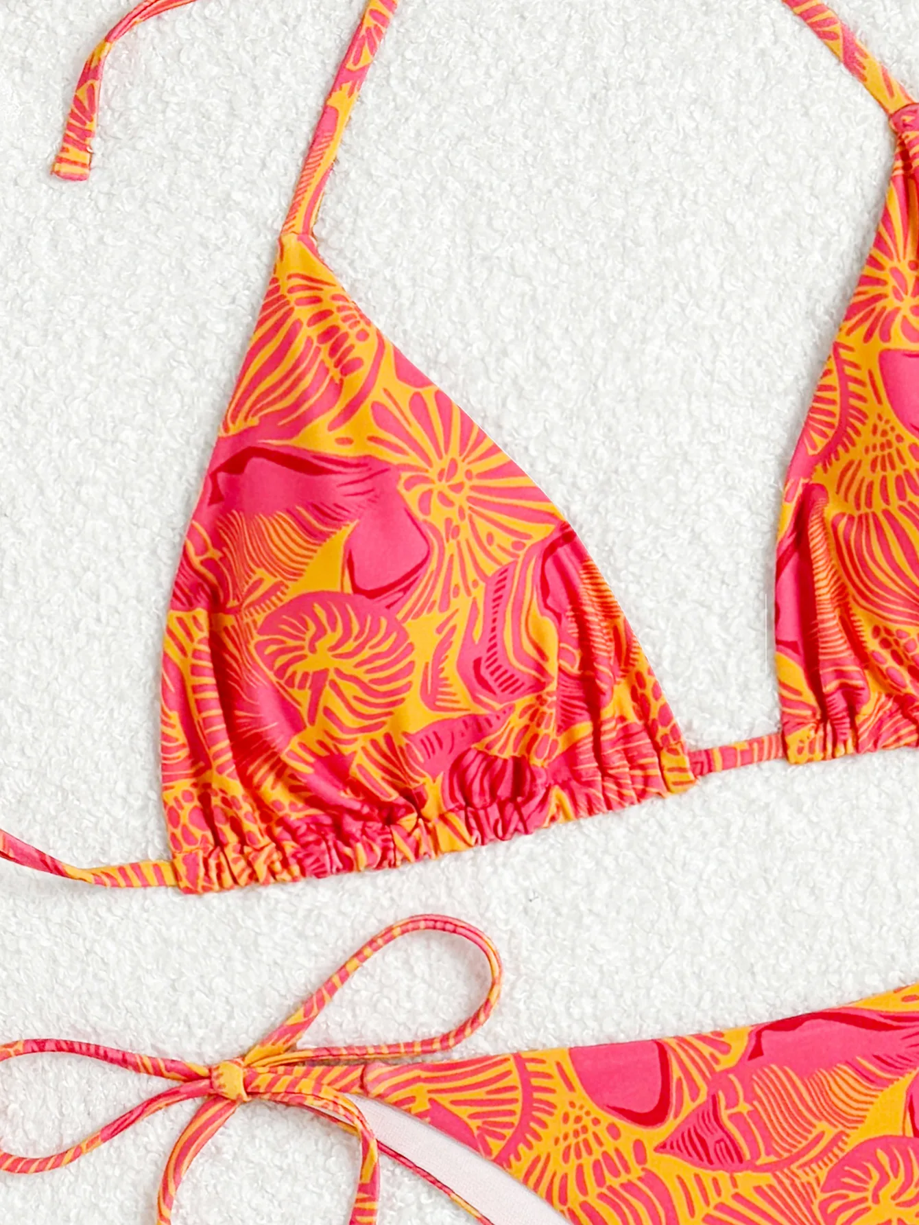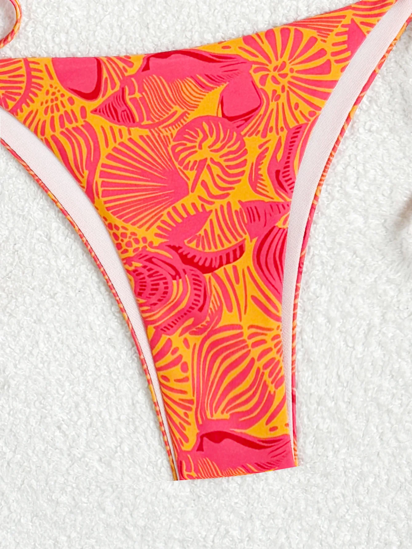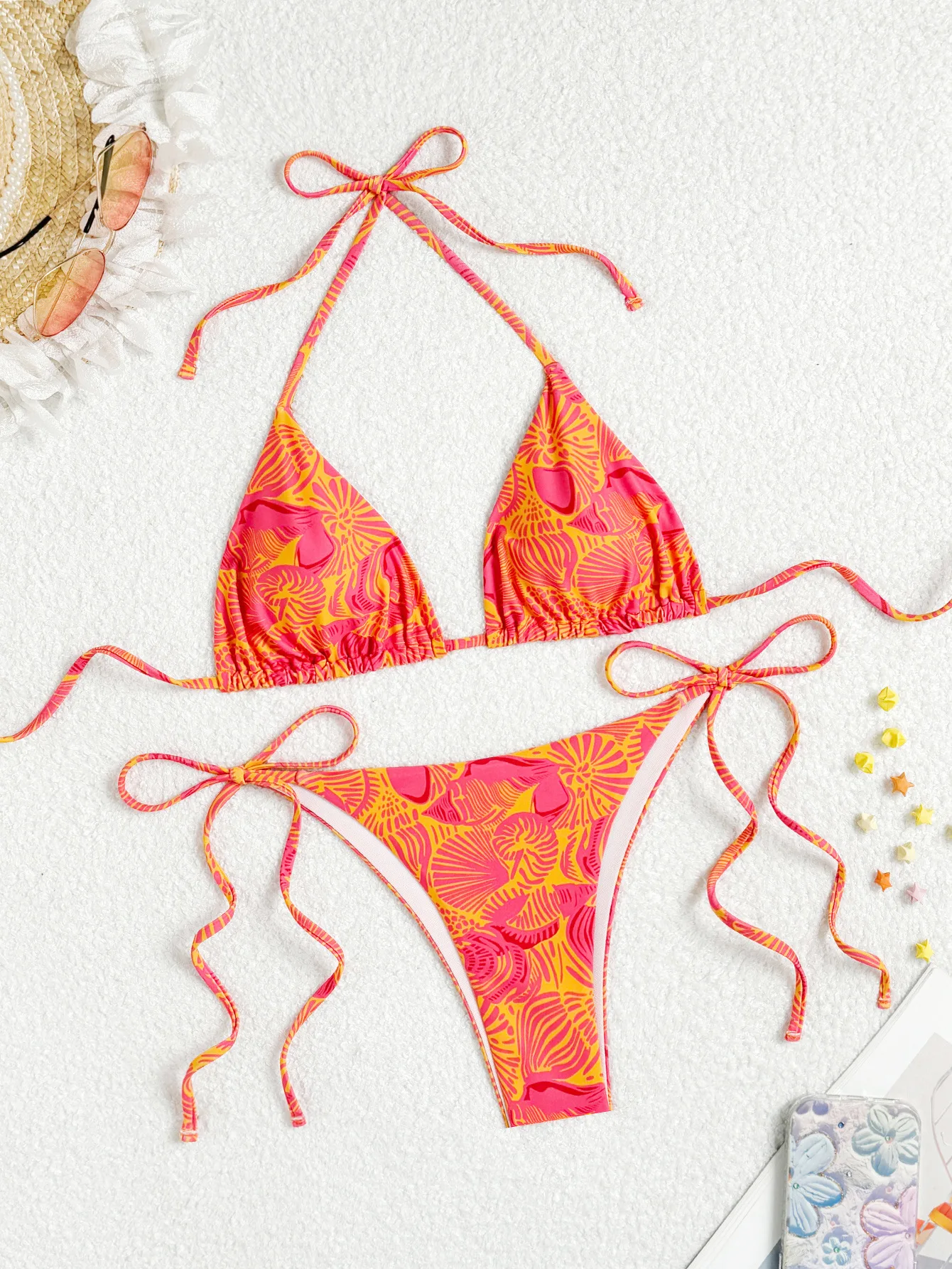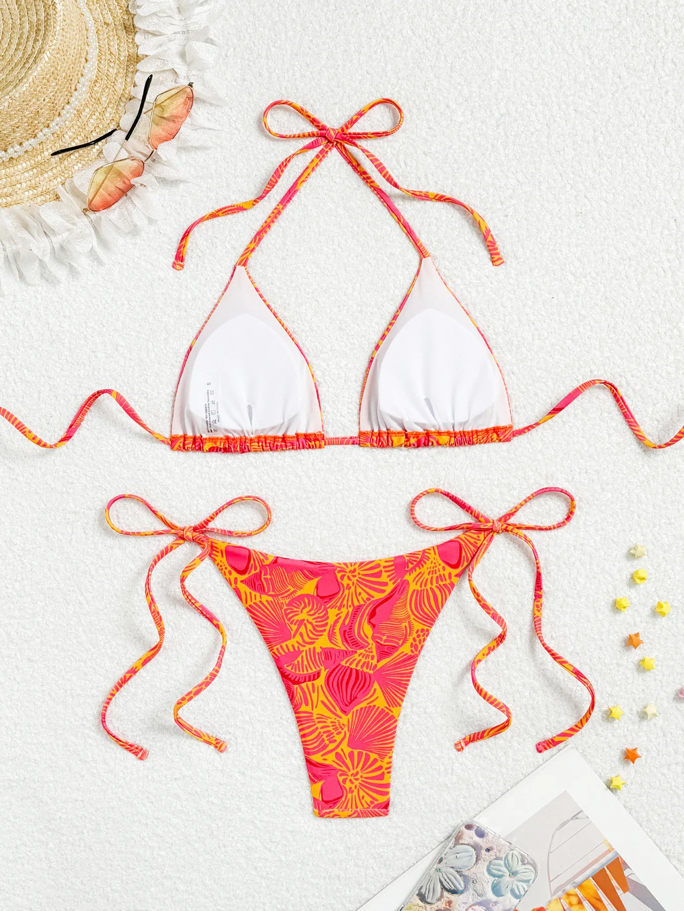 Custom 2026 New Sexy Print Cute Two Piece Bikini Set Triangle Halter Swimsuit Women Double Side Tie Thong Swimwear
