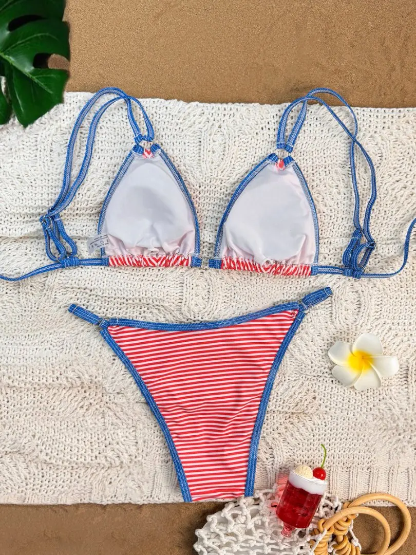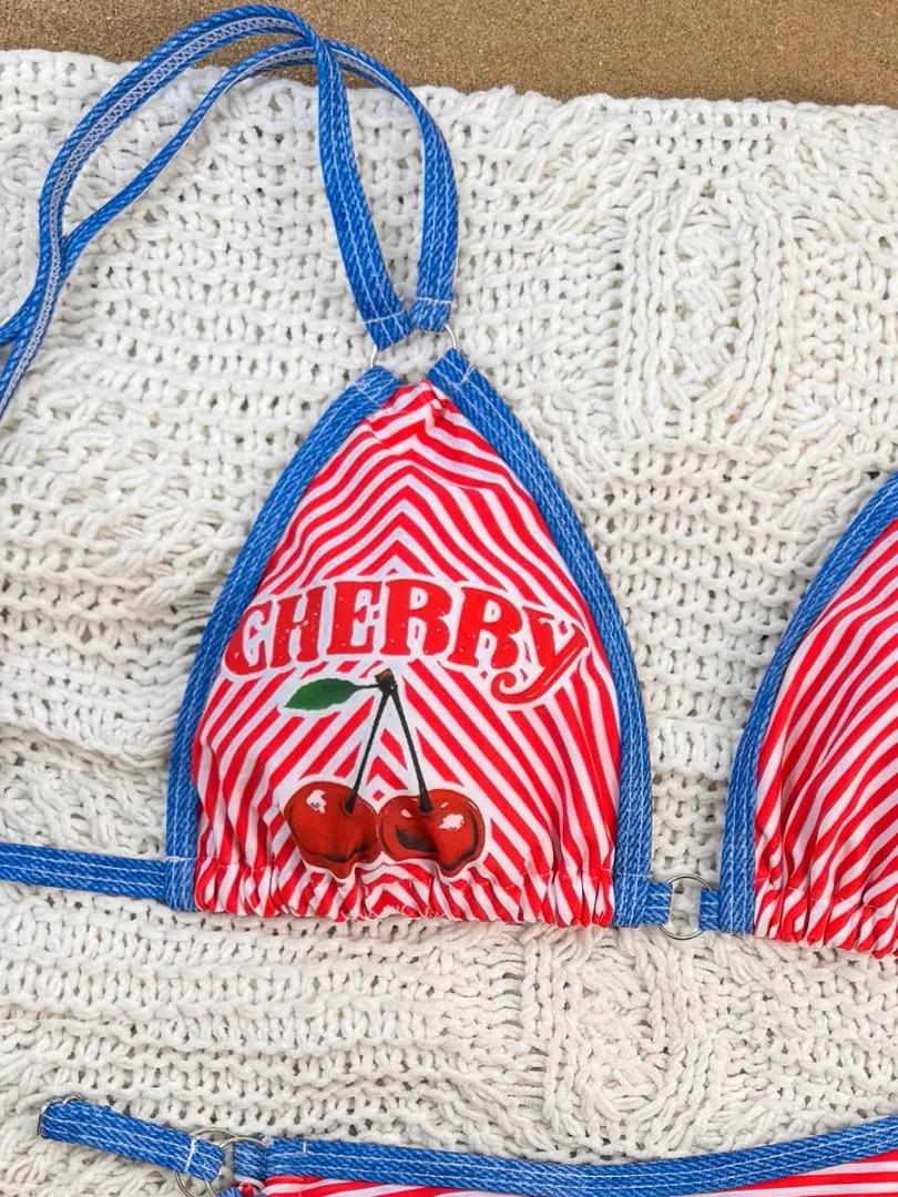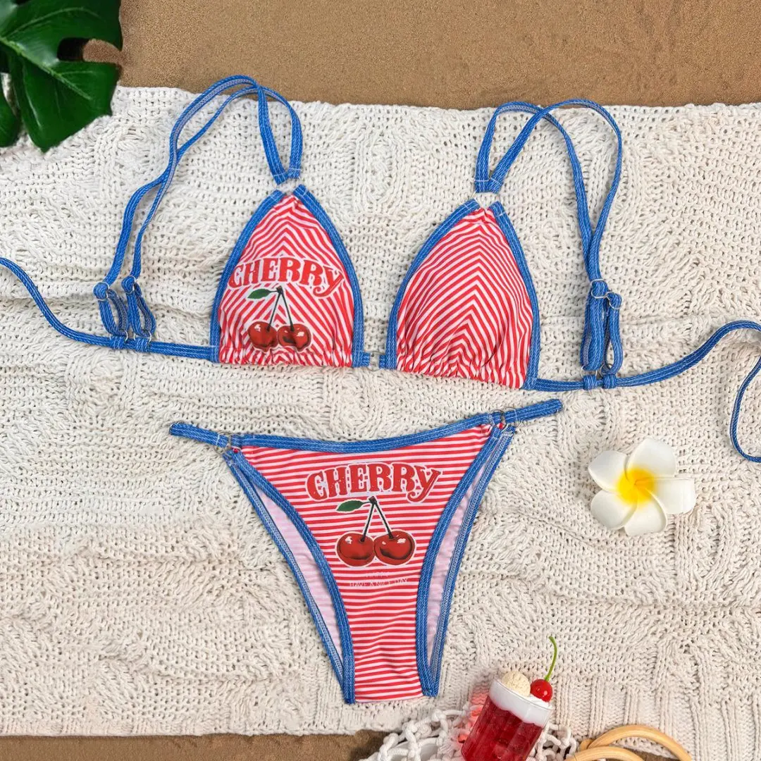 Custom 2026 New Cherry Sexy Print Cute Two Piece Bikini Set Triangle Halter Swimsuit Women Thong Swimwear