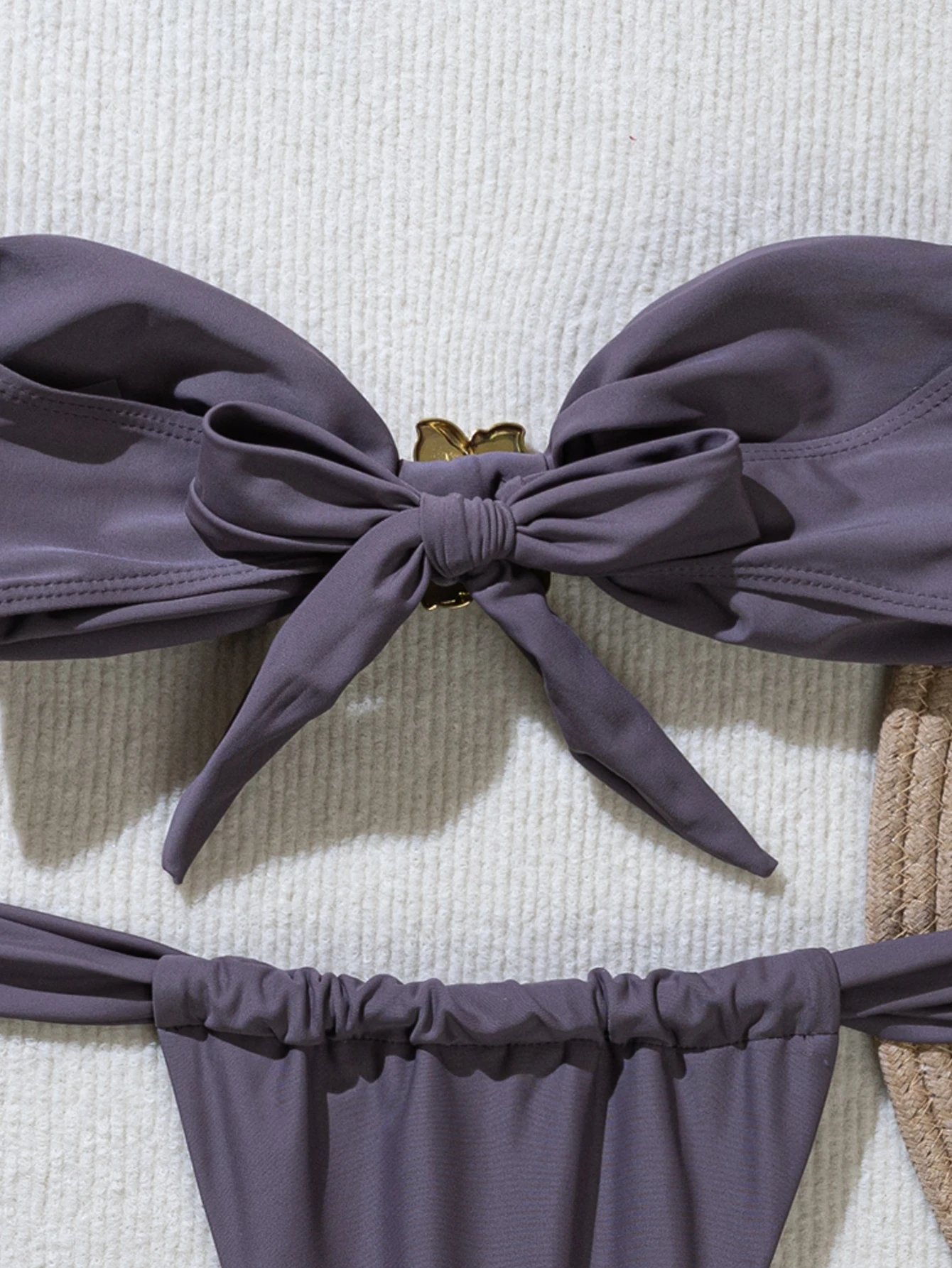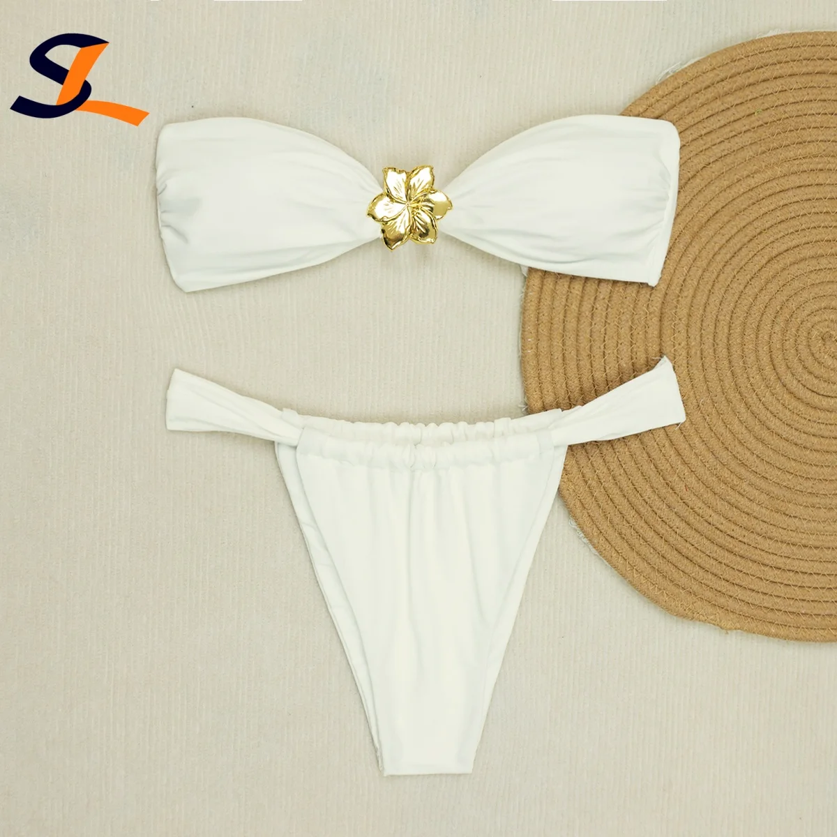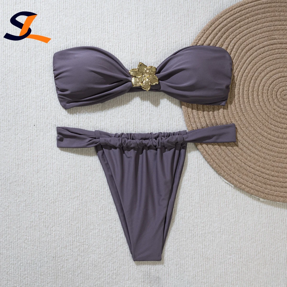 Custom New In Stock Metal Floral Sexy Solid Two Piece Bikini Set Beachwear Bandeau Swimsuit Women High Cut Thong Swimwear
