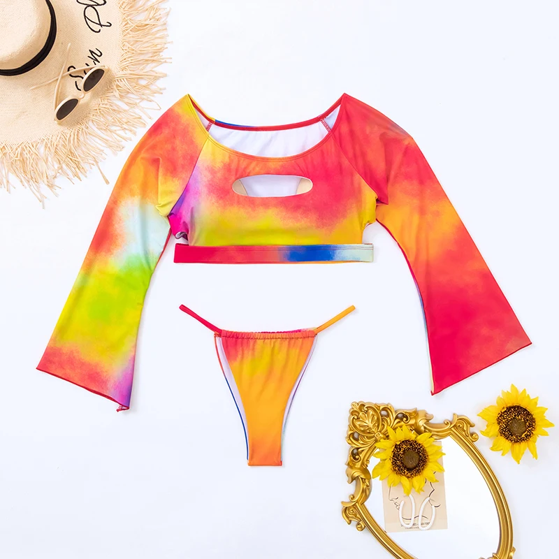 2026 New Sexy Print Long Sleeve Cutout Two Piece Couple Bikini Beachwear High Neck Swimsuit Women Micro Mini Thong Swimwear