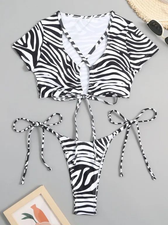 2026 New Sexy Leopard Two Piece Bikini Beaachwear Short Sleeve Front Cross Swimsuit Women Side Tie Thong Swimwear