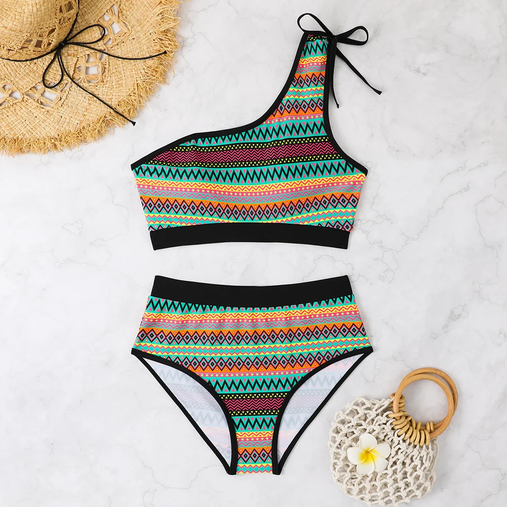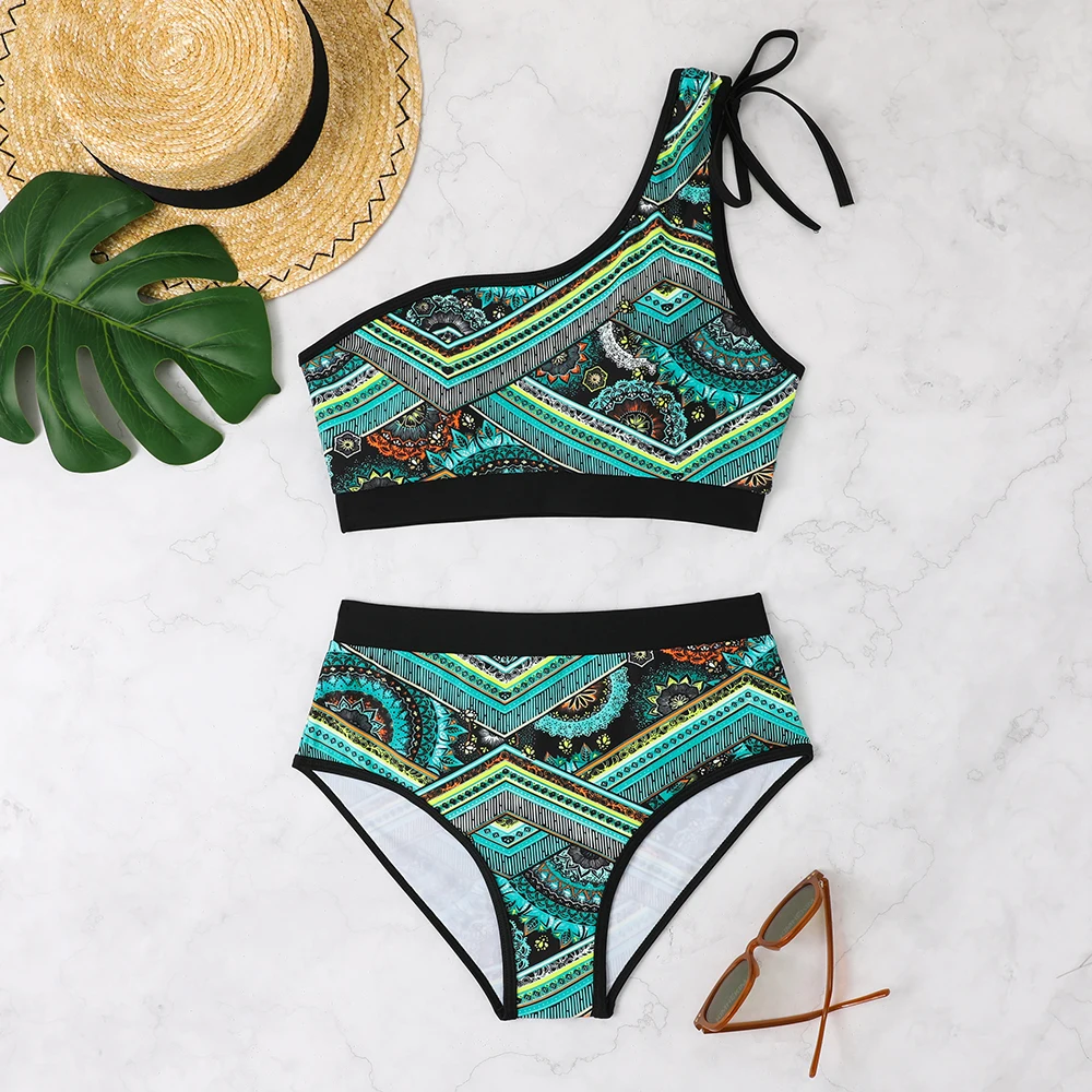OEM Sexy Print One Shoulder Two Piece Bikini Beachwear Bandeau Swimsuit High Waist Swimwear