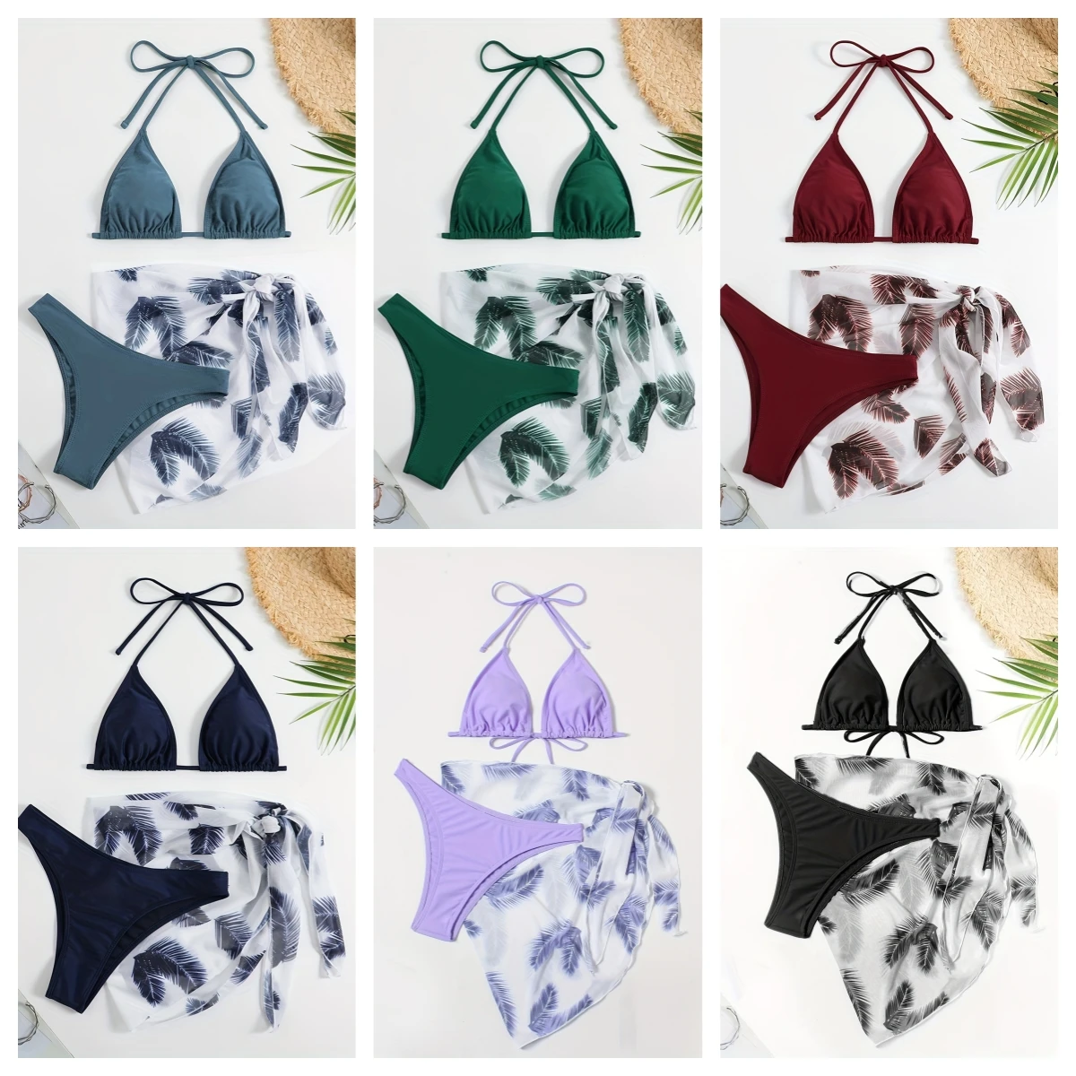 Custom New Sexy 3 Piece Bikini Set Beachwear Halter Triangle Swimsuit Women Swimwear With Mesh Sarong Cover Up