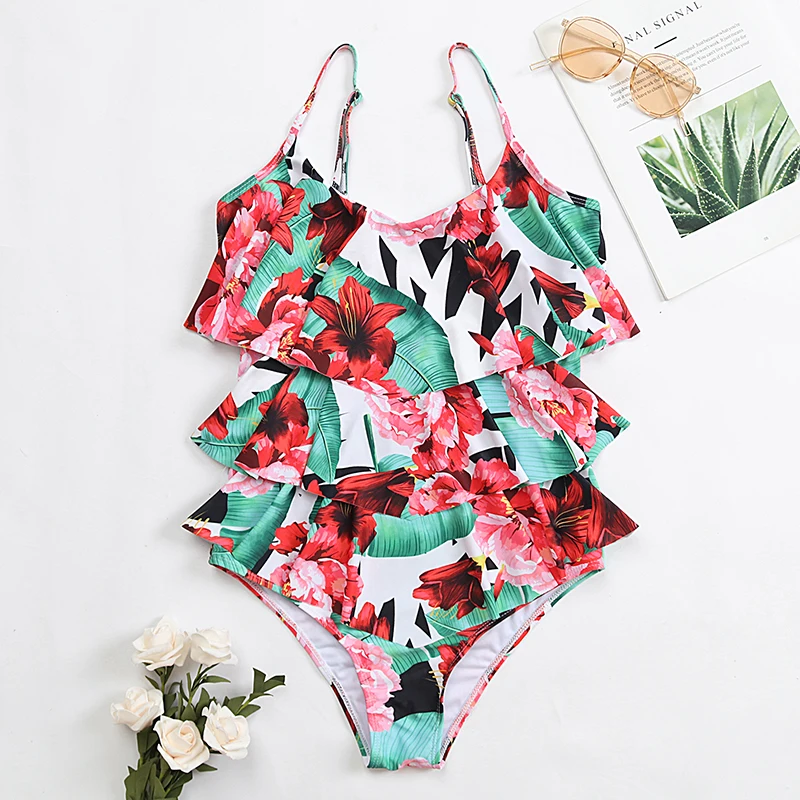 2026 New Trend Sexy Print One Piece Bikini Beachwear Bandeau Swimsuit Women Ruffle Swimwear Tankini