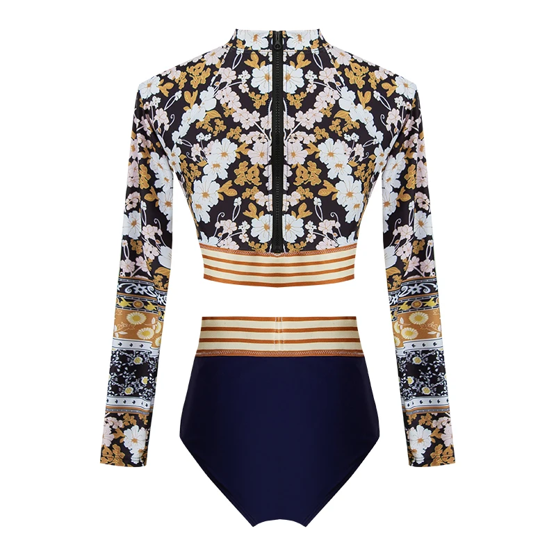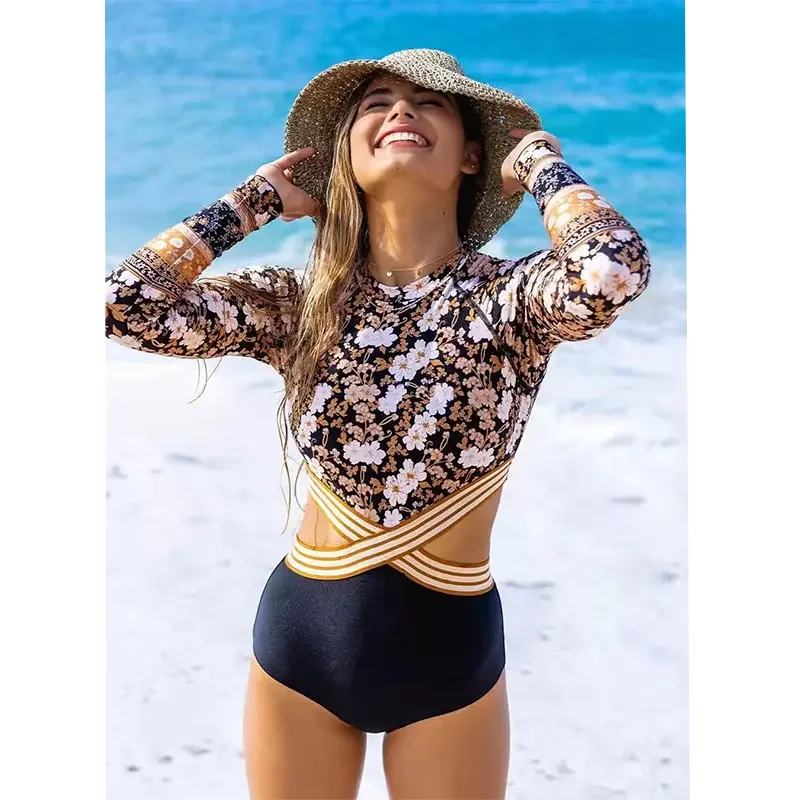 Custom New Design Sexy Cutout One Piece Bikini Beachwear Long Sleeve Back Zipper Surfing Swimsuit Women Front Cross Swimwear