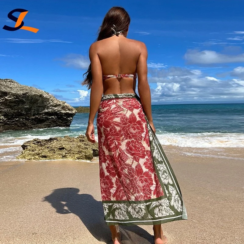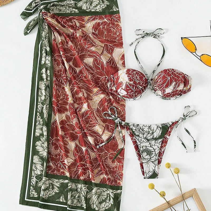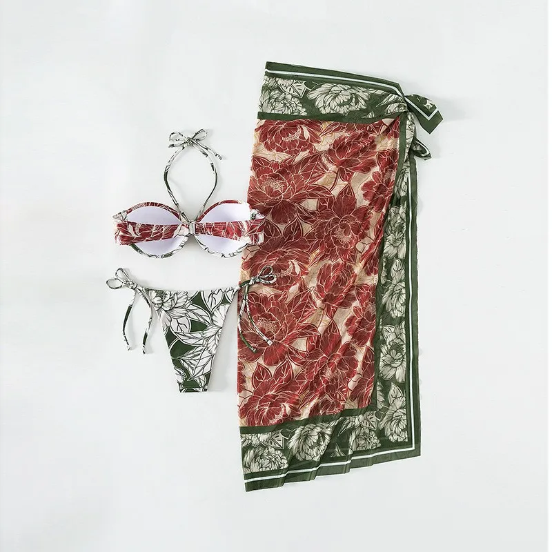 Custom Logo New Sexy Print 3 Piece With Sarong Cover up Bandeau Halter Swimsuit Women Push up Underwire Swimwear