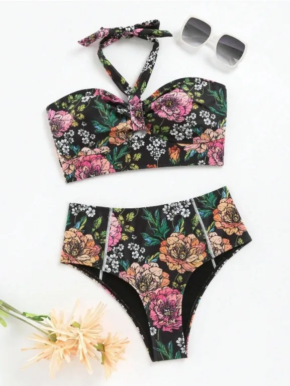 Custom Private Label New Sexy Floral Print Two Piece Bikini Beaachwear Bandeau Halter Swimsuit Women High Waist Swimwear