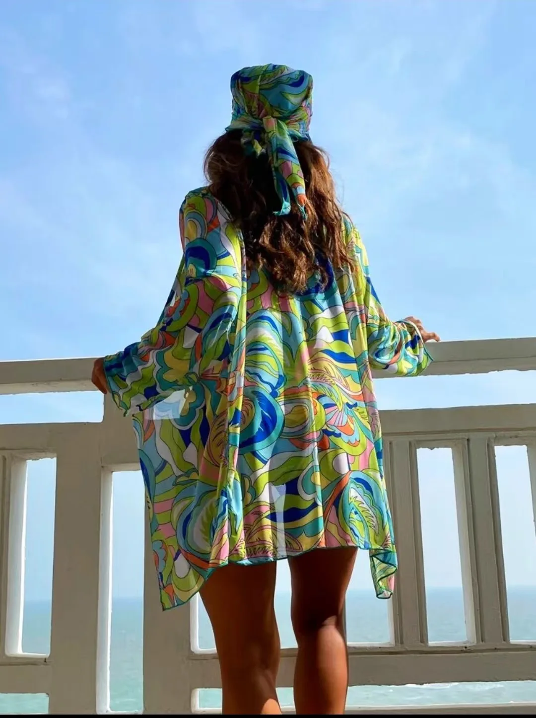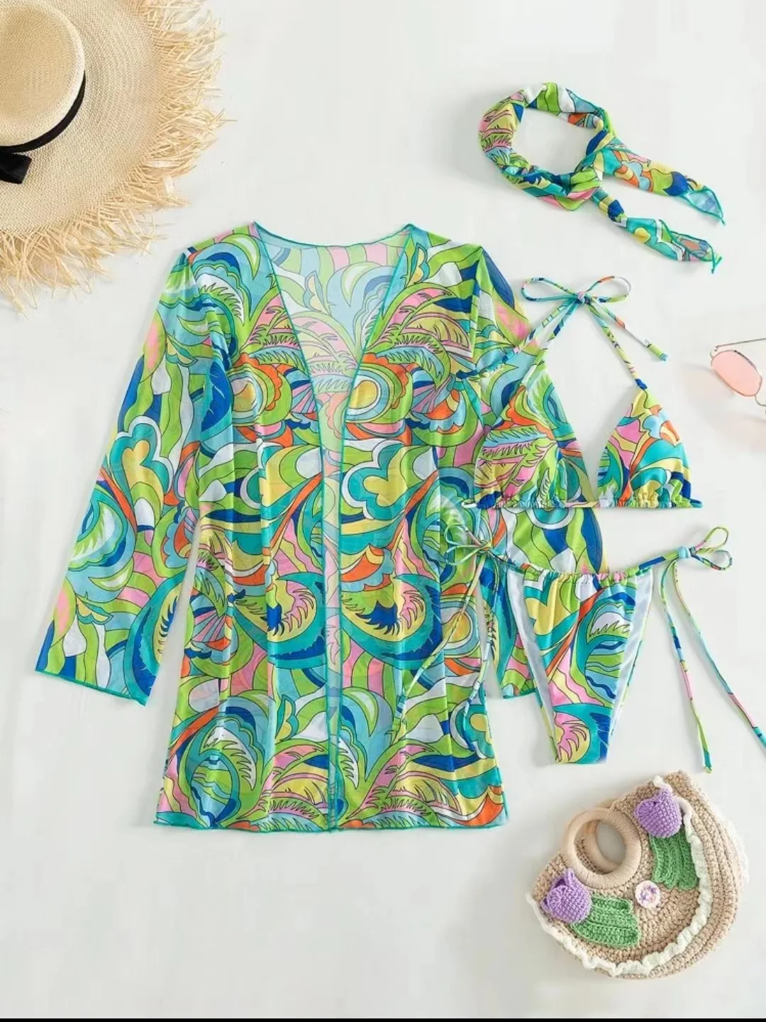 Custom New Sexy Print Micro Two Piece Bikini Beachwear With Long Sleeve Cover up Triangle Halter Swimsuit Women Thong Swimwear