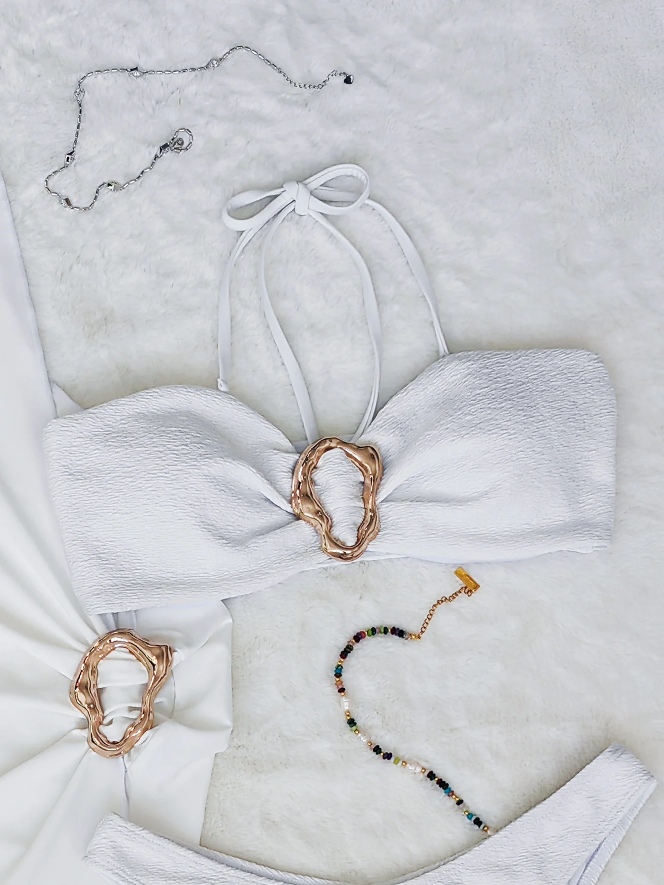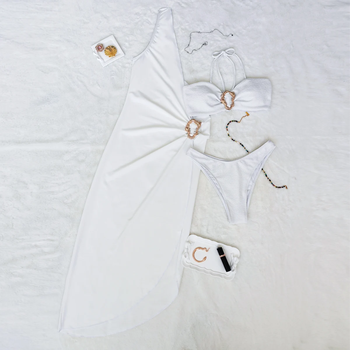 2026 New Sexy Custom Logo Solid 3 Piece Bikini With Sarong Cover up Bandeau Metal Swimsuit Women Side Tie Thong Swimwear