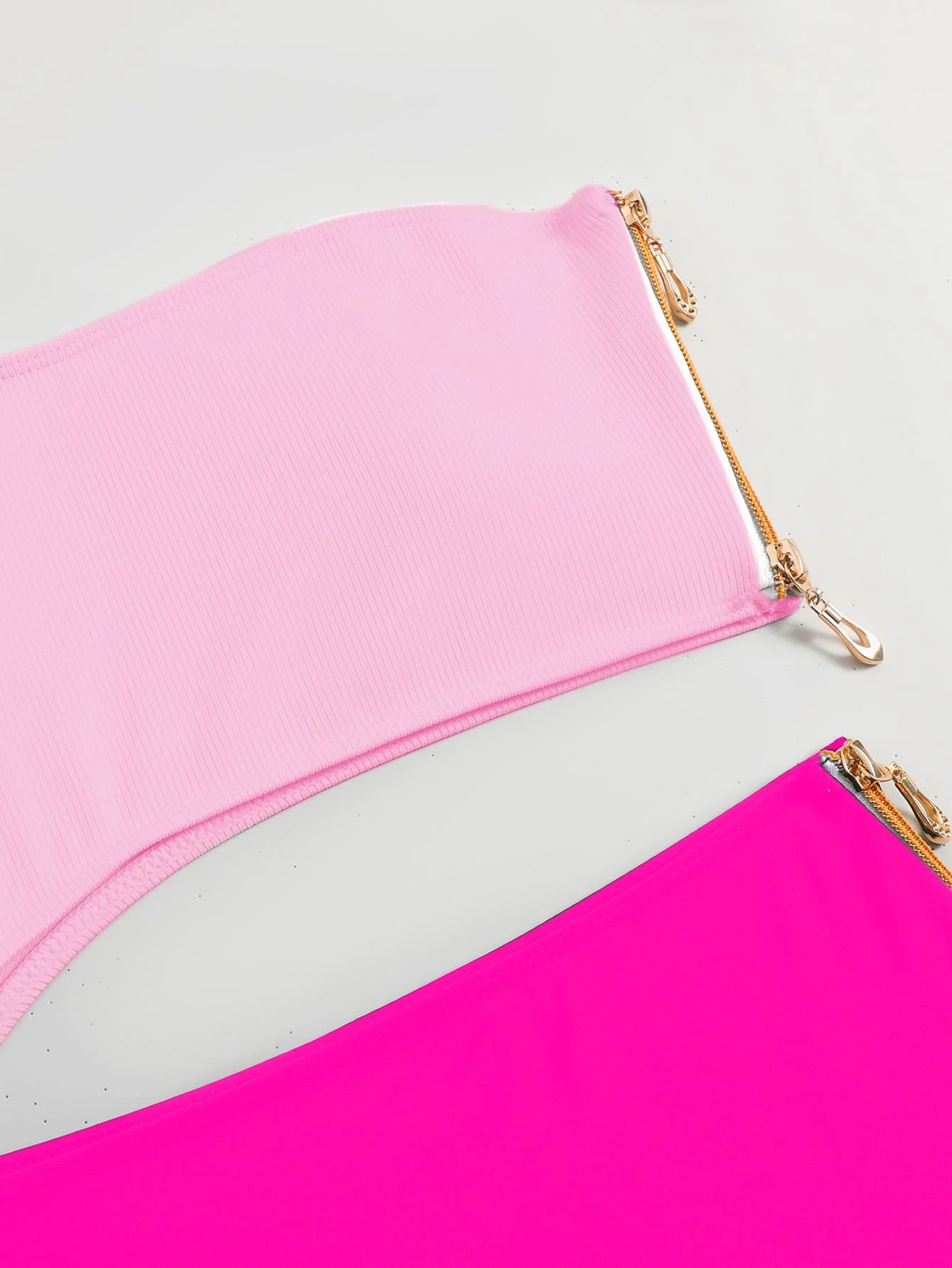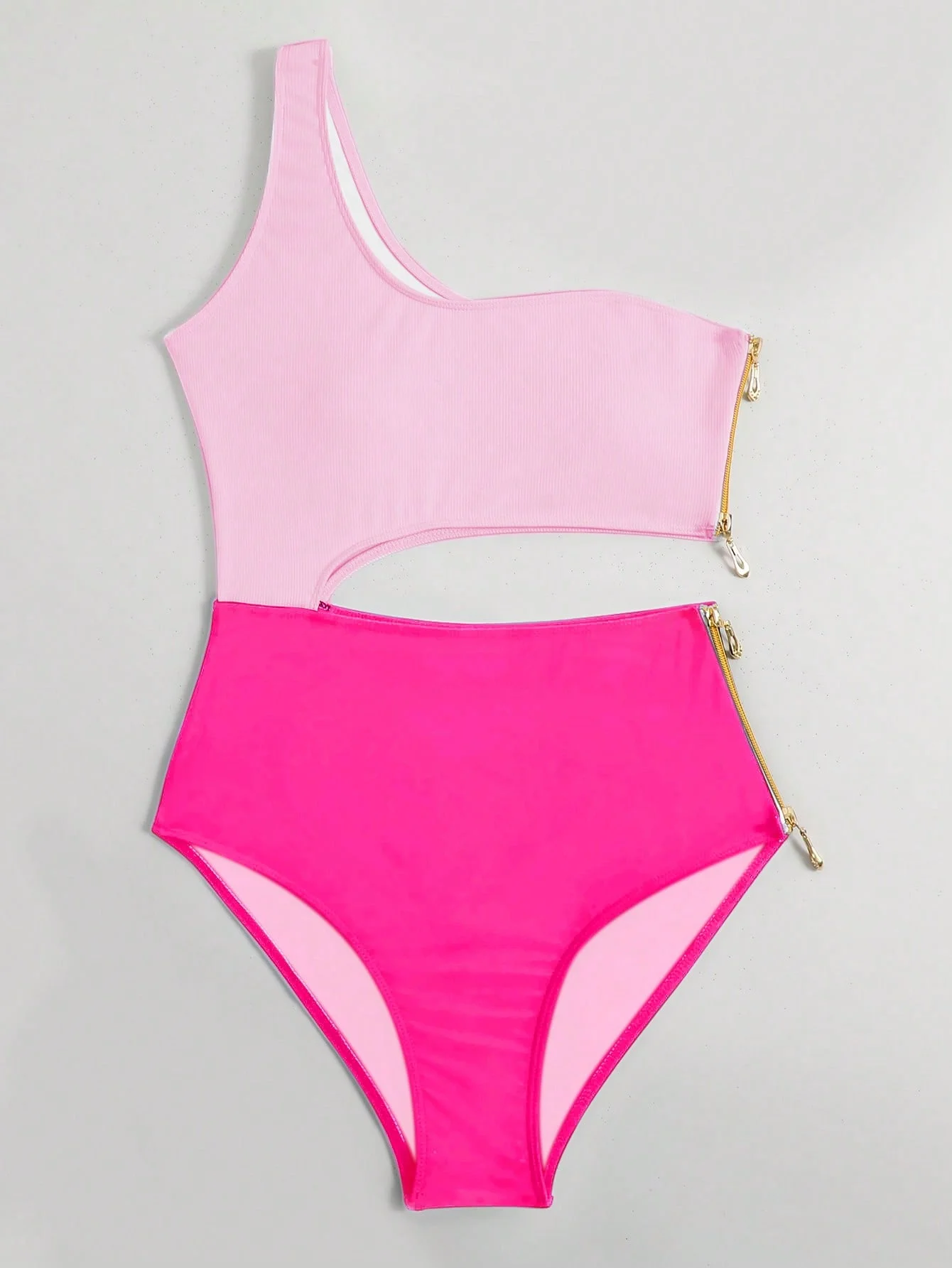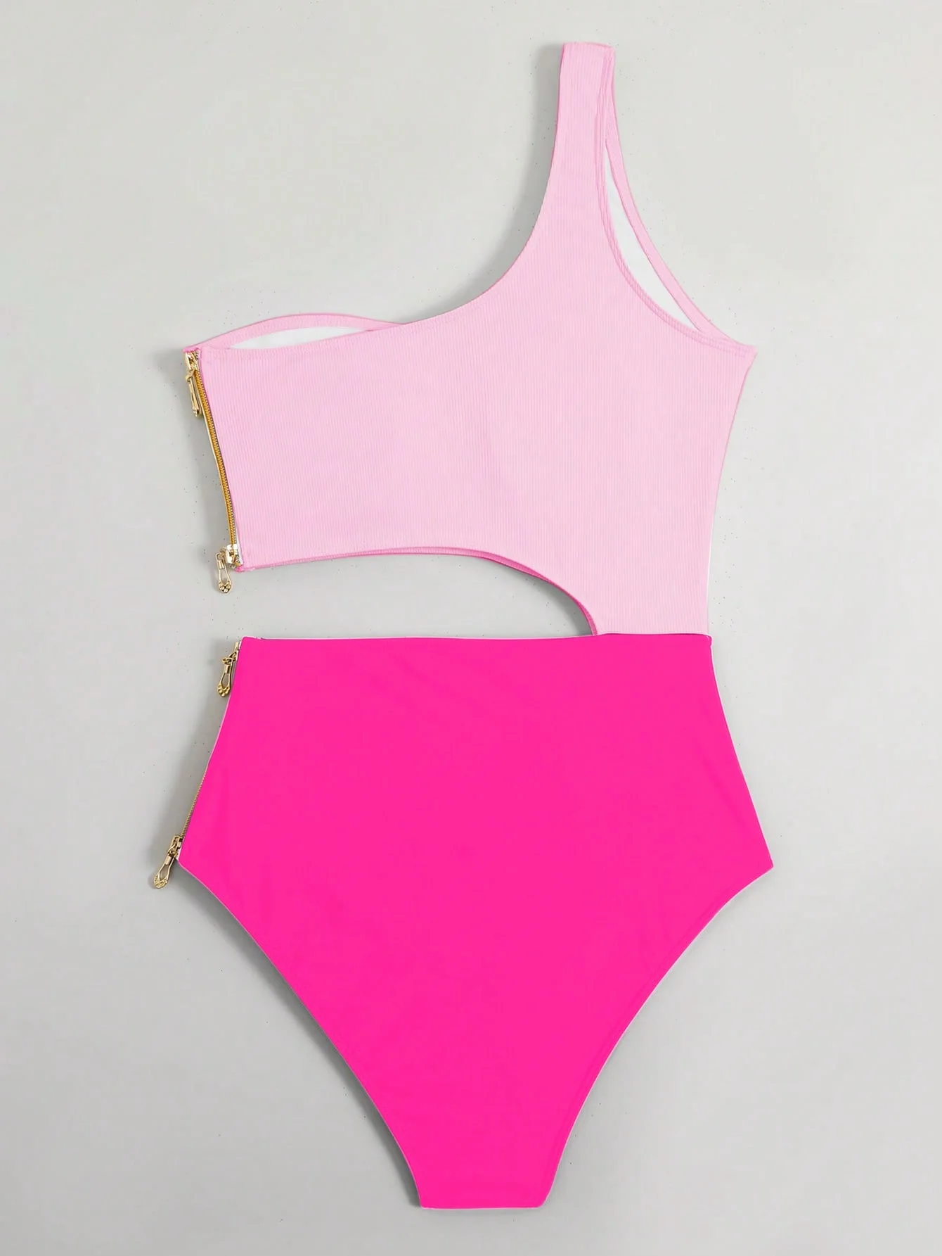 Custom New Design Solid Patchwork Sexy One Shoulder One Piece Bikini Side Zipper Swimsuit Women Ribbed Swimwear Monokini