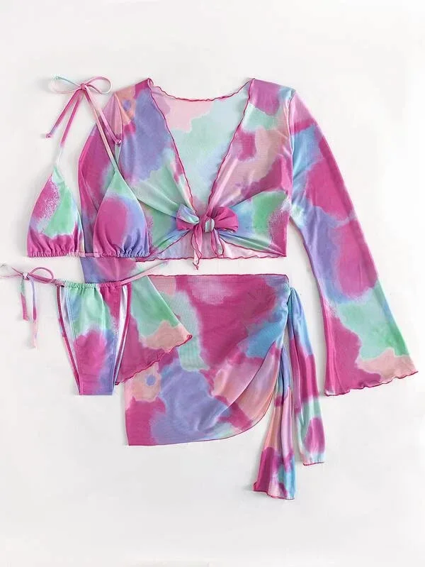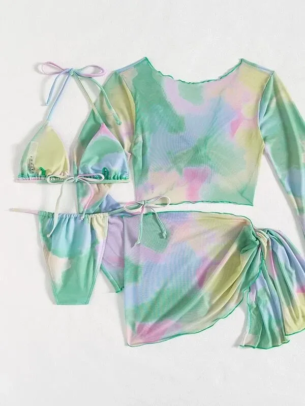 2023 New Design Sexy Print Mini Micro 4 Piece Bikini Set Beachwear With Mesh Skirt and Long Sleeve Cover up Women Thong Swimwear