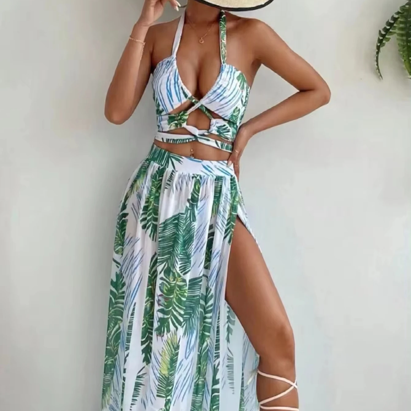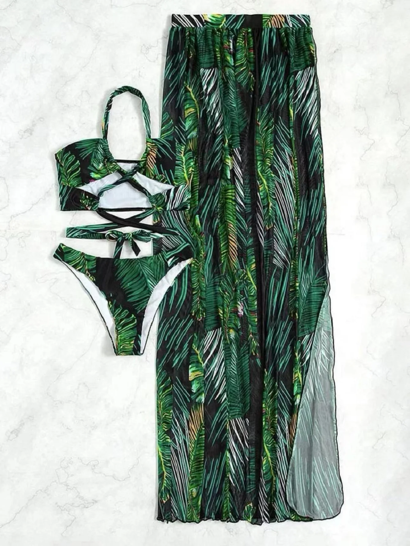 Custom 2026 New Print Sexy Bandage 3 Piece Bikini With Cover up Front Cross Tie Swimsuit Women Bandeau Thong Swimwear
