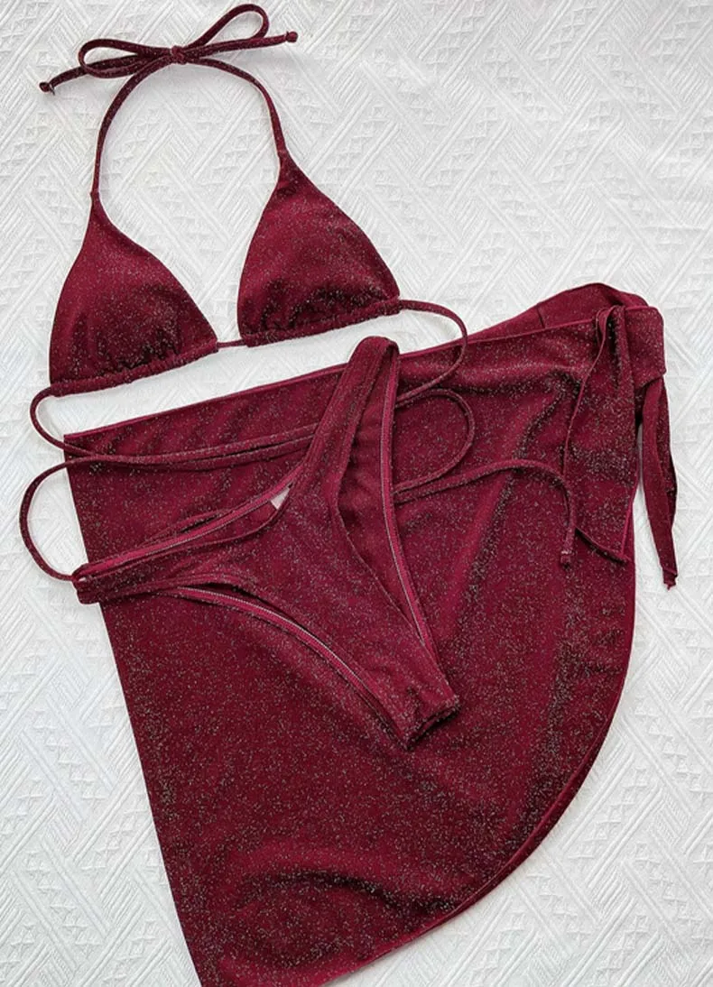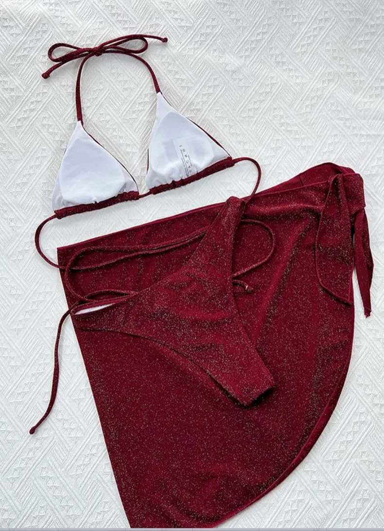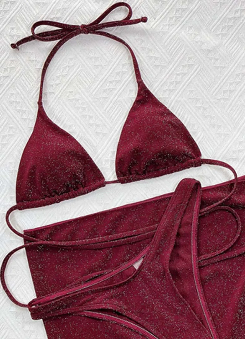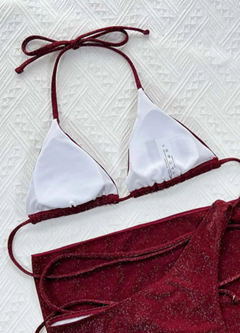 Custom New Shiny Glitter Sexy Print 3 Piece Bikini With Sarong Cover up Triangle Swimsuit Women Thong Swimwear