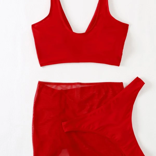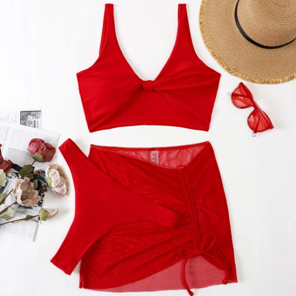 YY5121 2026 New Women Sexy Swim Suit Red Bathing Suit Halter Swimwear Cover up 3 Piece Set Bikini With Skirt
