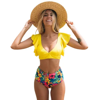 Floral Ruffled Hem V-Neck High Waist Bathing Suit XL Print Swimwear Push Bikinis Set with Beach Floral Ruffles Floral Bikini Set
