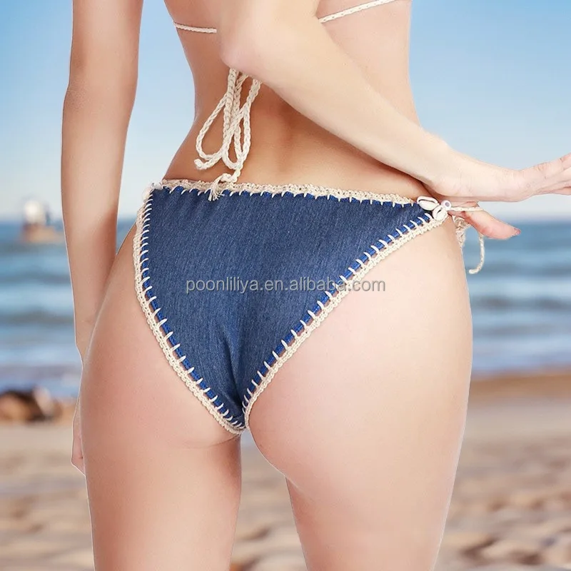 Private Label Handmade Crochet Denim Blue 2-Piece Triangle Push-Up Bikini Leopard/Plaid Side Stripe Waist Logo for Women