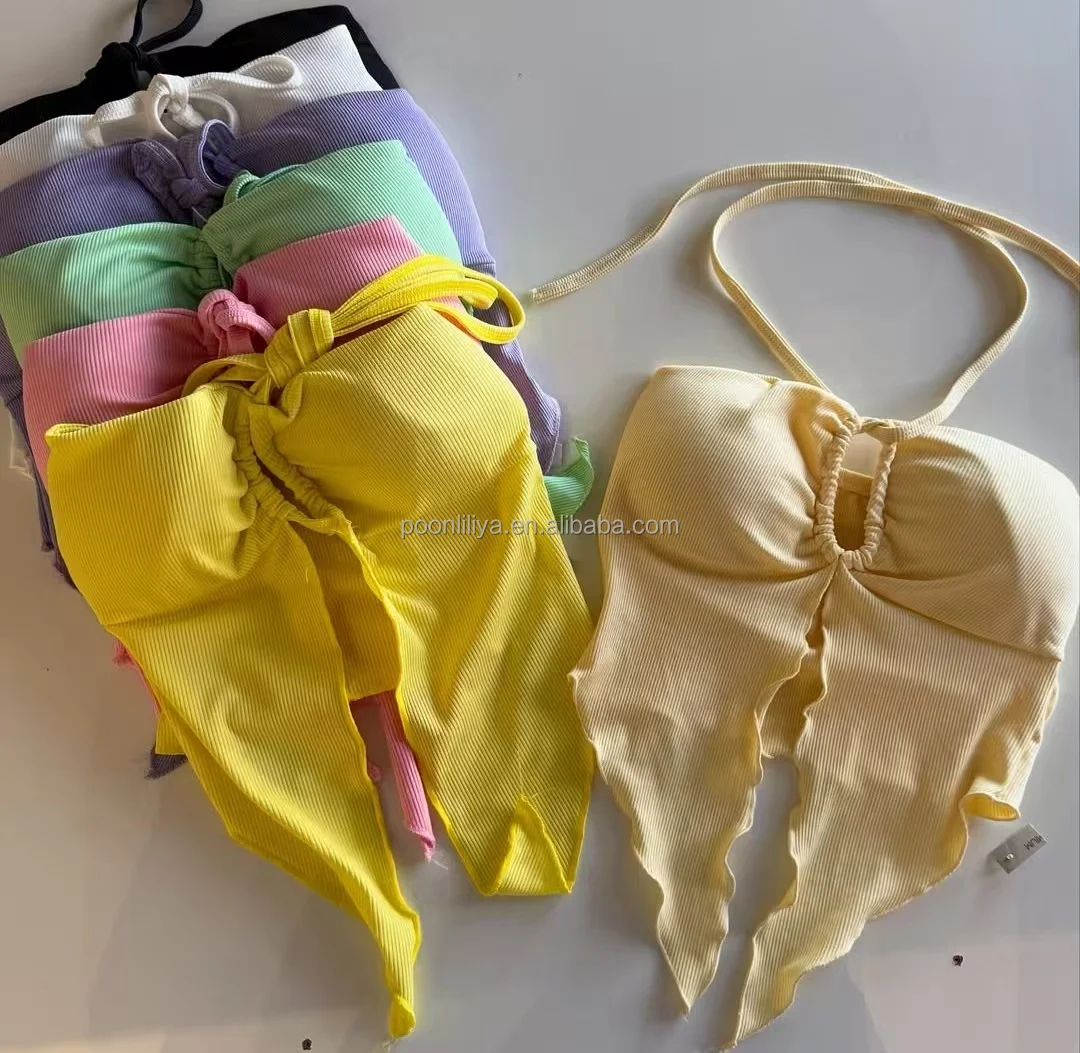 Breathable Solid Eco-Friendly Ruffle Trim Two Piece Swimwear Beachwear Halter Crop Top Tie Side Hipsters Designer Swimsuit Women