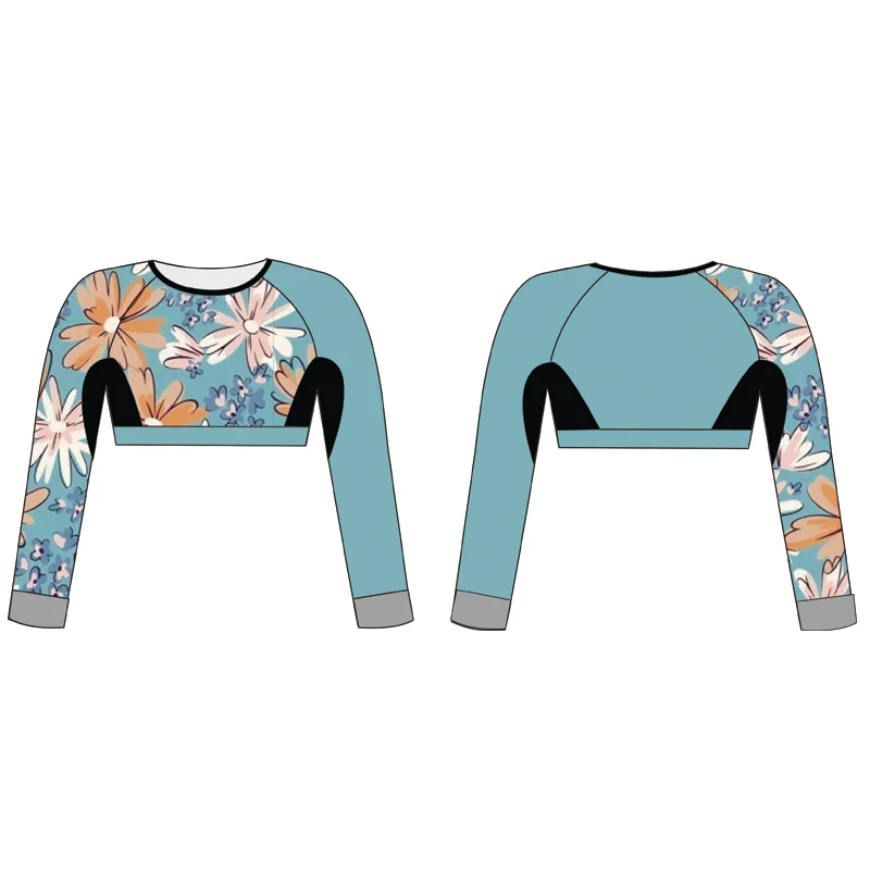 Handmade Women's Sexy 2-Piece Surf Swimwear Long Sleeve Rash Guards with Sequined Zippered Feathers and Paisley Pattern Print