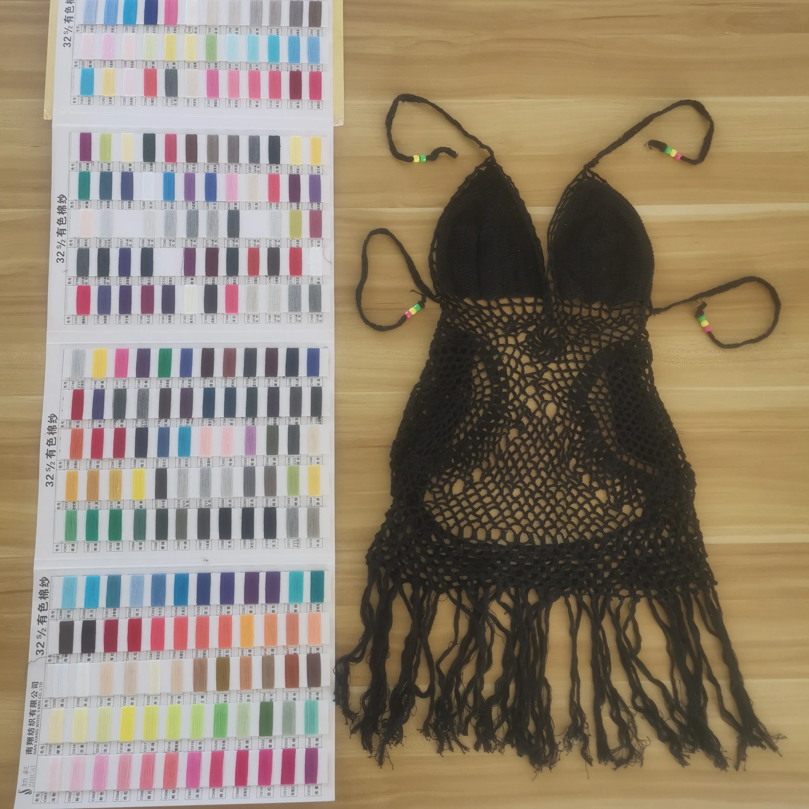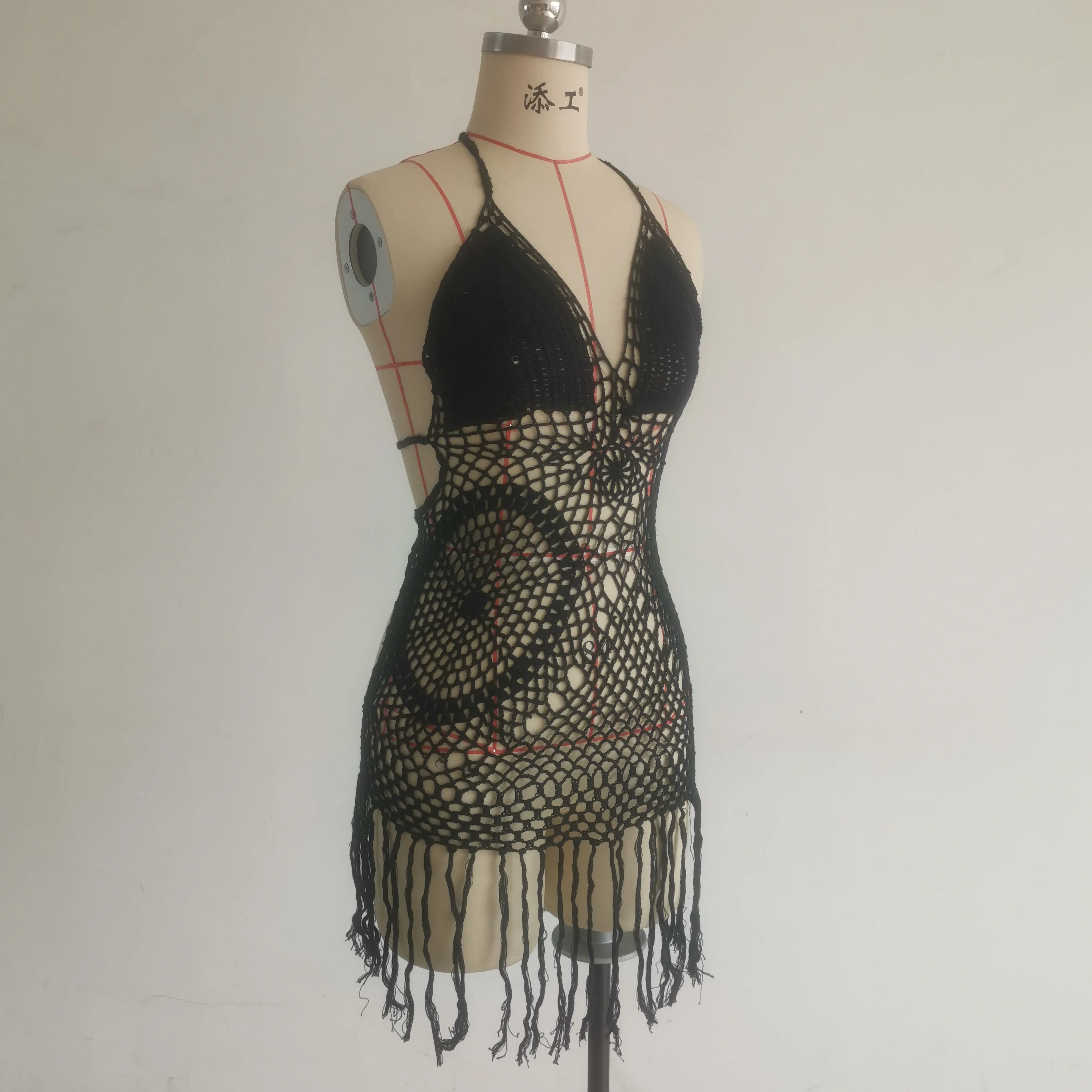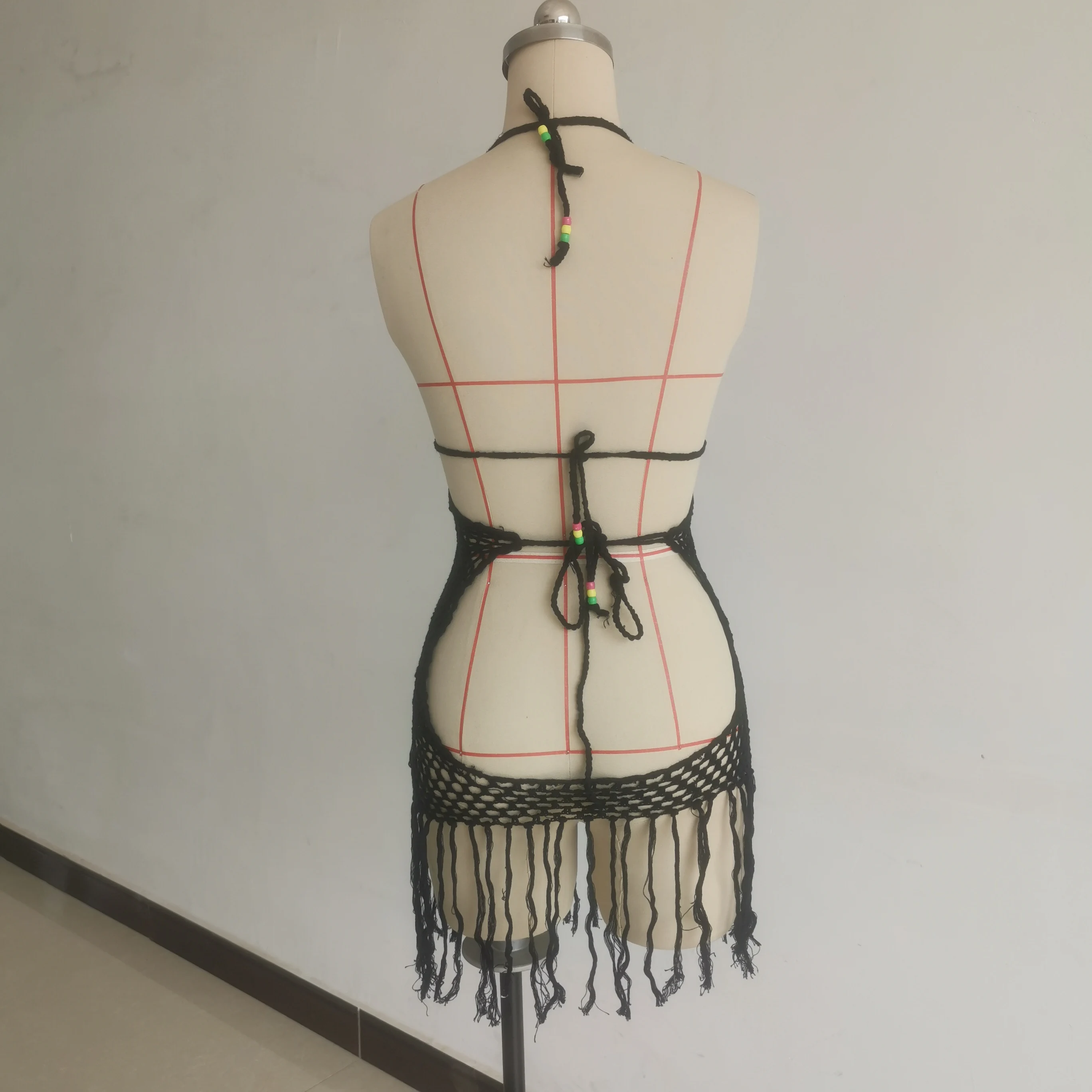 OEM Handmade Crochet Bikini Set Halter Shoulder Bathing Suit Dress with Sexy Tassels and Drawstring Decoration Short Beachwear