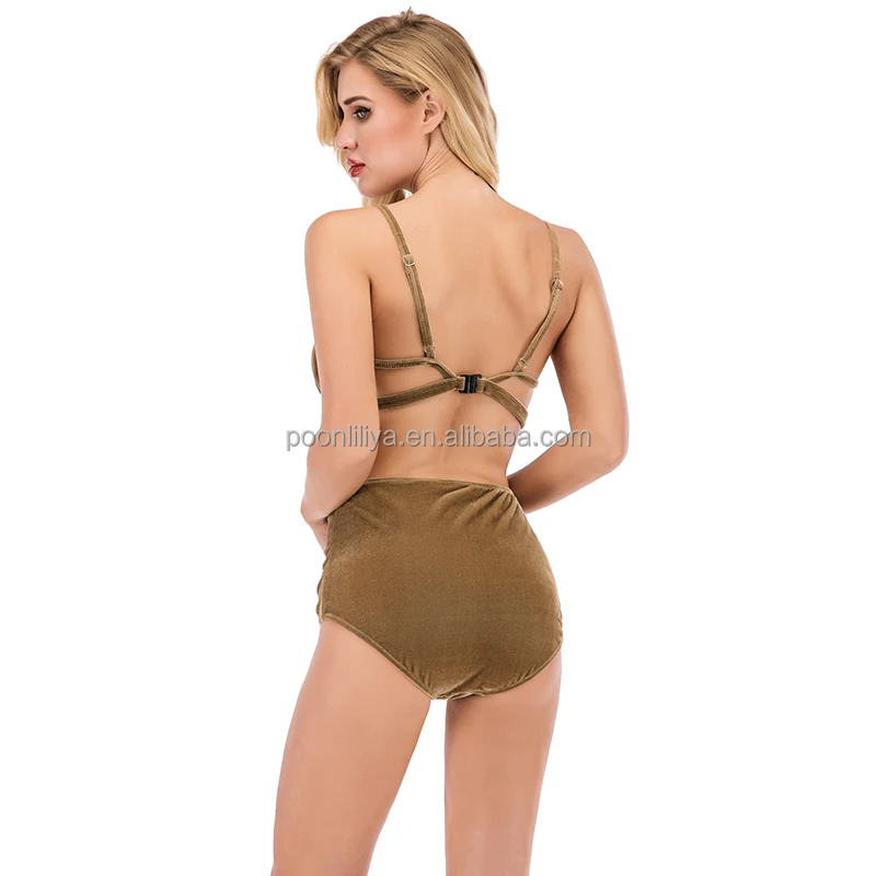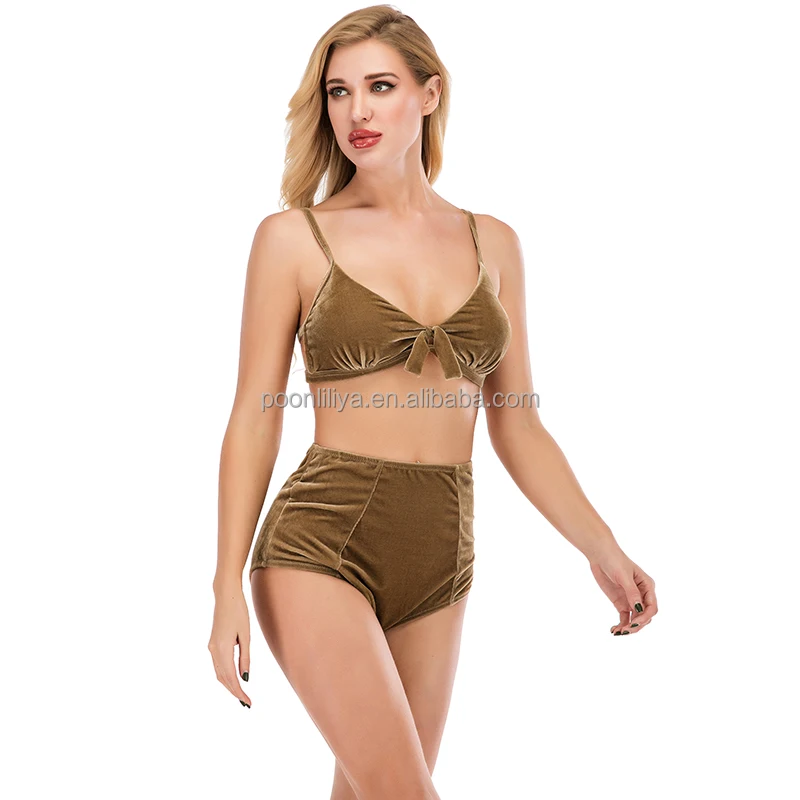 Customized Asian Hot 18 Teens School Girls Sexy Tight High Waist Contest Brown Velvet Bikini Swimwear Feathers Zippers