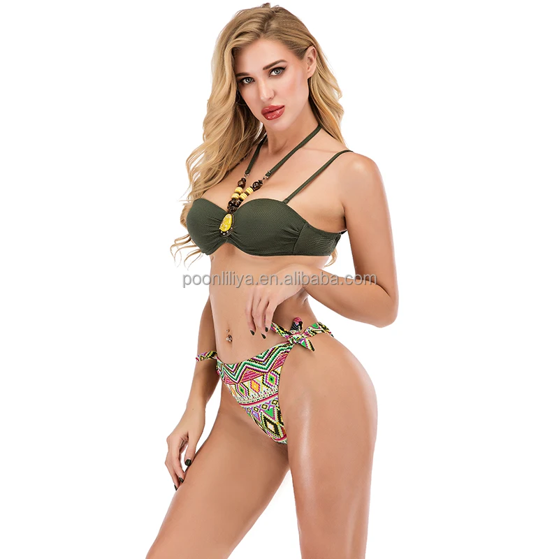 Handmade Sexy Crystal Crotchless Bikini Swimwear for 2-18 Years Girls African Inspired Print Push Bra Cut Decoration Wood Bead