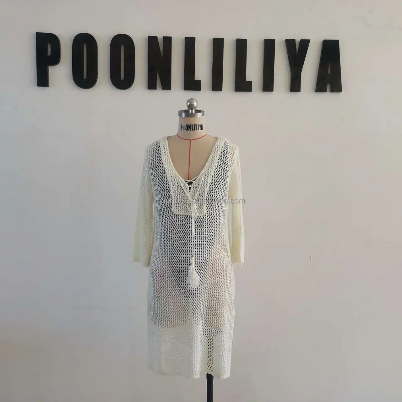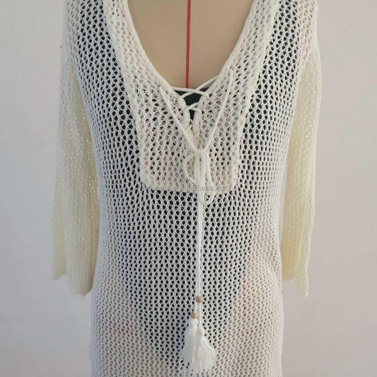 Customizable Back Asymmetrical Neck Beach Coverups Dress Big Mesh Tassel Digital Loose Fit Knee-Length Breathable Solid