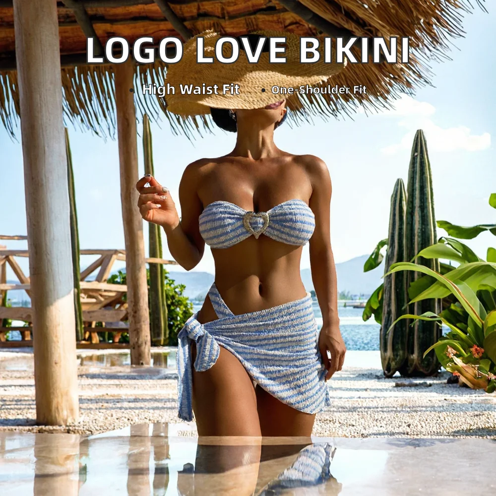 Customized Logo Women's Three-Piece Strapless Beach Resort Swimsuit Sexy Striped Bikini with High Waist Bottom Solid Pattern
