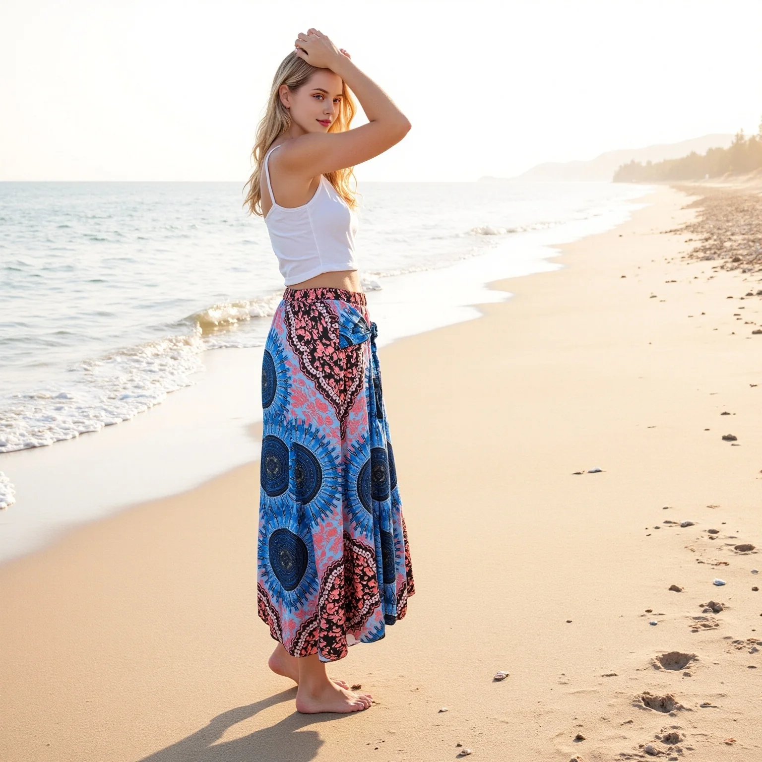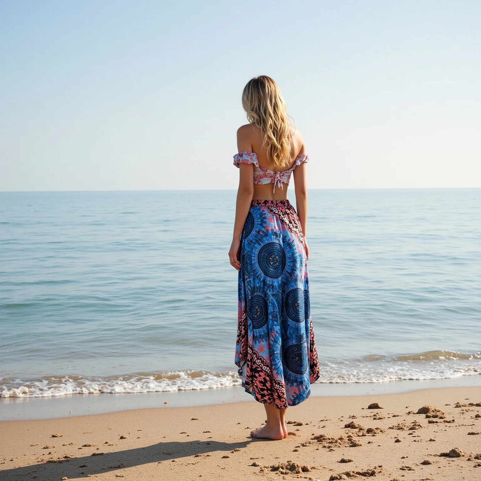 Womens White Off-Shoulder Geometric Sleeve Tankini Beach Swimsuit Set Bohemian Maxi Skirt High-Waist Stretch Customizable Colors