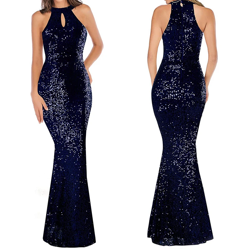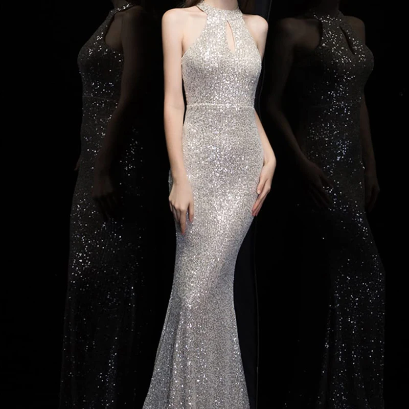 18600# Elegant Long Halter Evening Dress Custom Sequin Fishtail Design New Party Temperament Empire Waistline Chiffon Cashmere