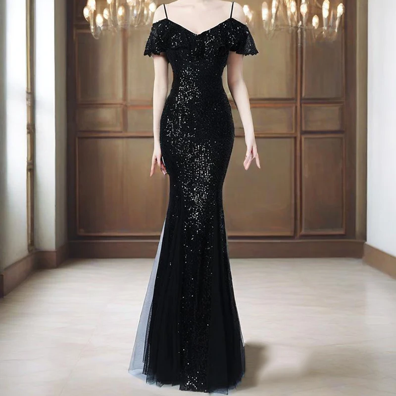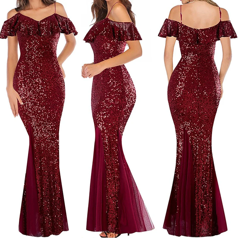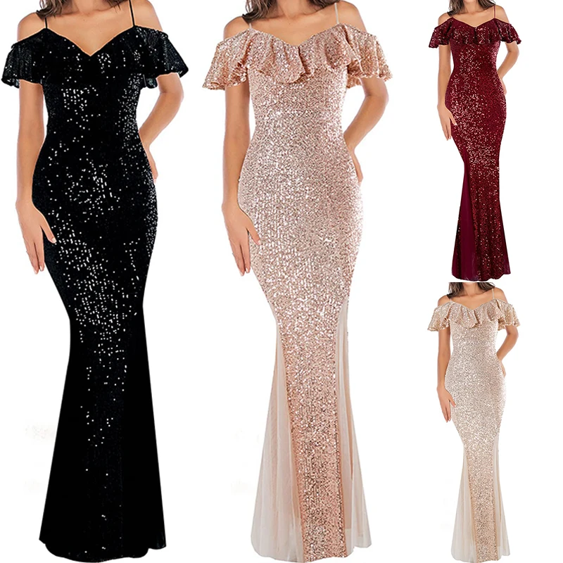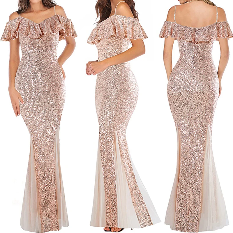 New Design Women Sequin Tulle Evening Party Dress Strap Ruffle Formal Maxi Long Dress Prom Gown